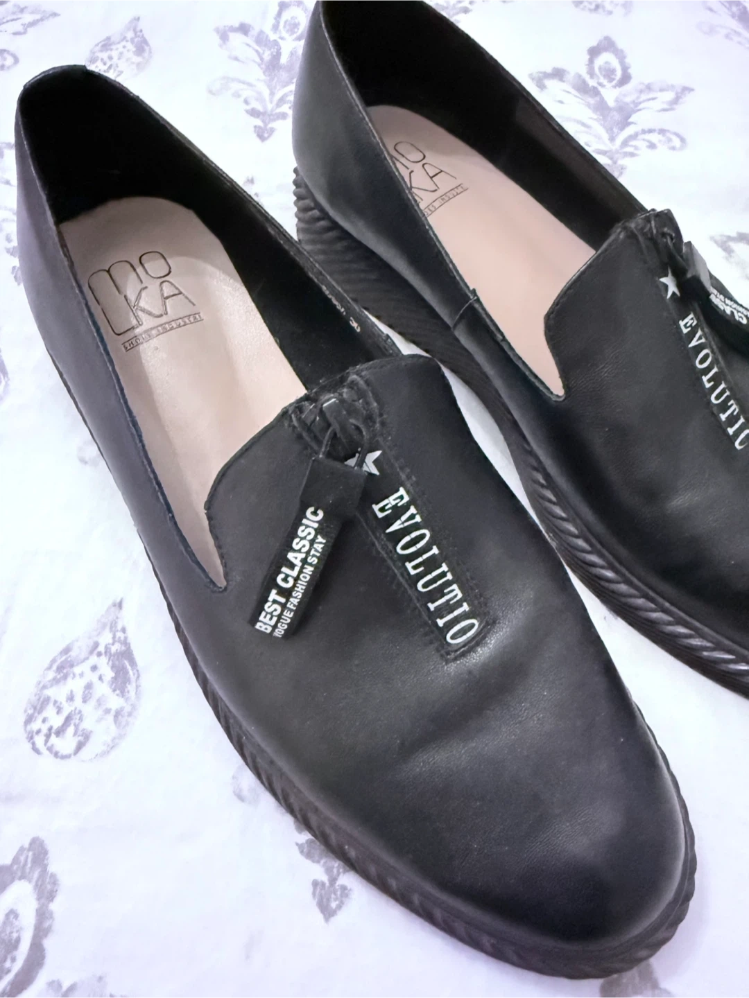 Selling a pair of MOLKA Evolution loafers in black, size 38. They have a unique design with 'EVOLUTION' written on the front. These shoes are in good condition and ready for a new owner!