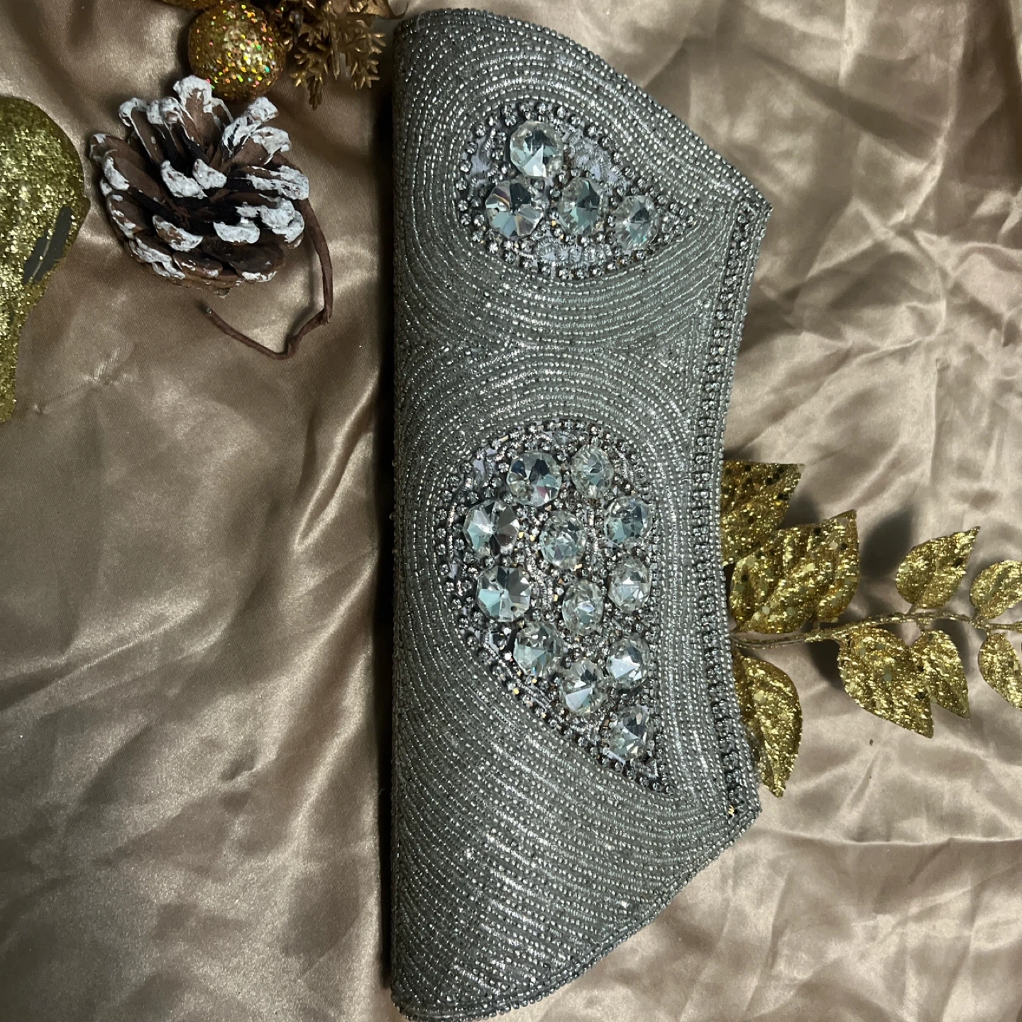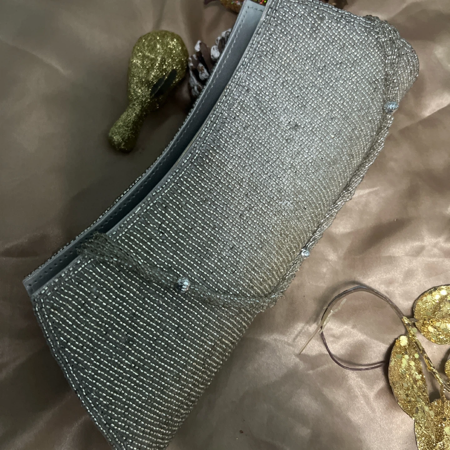 A beautiful silver beaded evening clutch, perfect for a special occasion! It has a lovely beaded design with sparkling stones. It's in great condition and ready to add some sparkle to your outfit