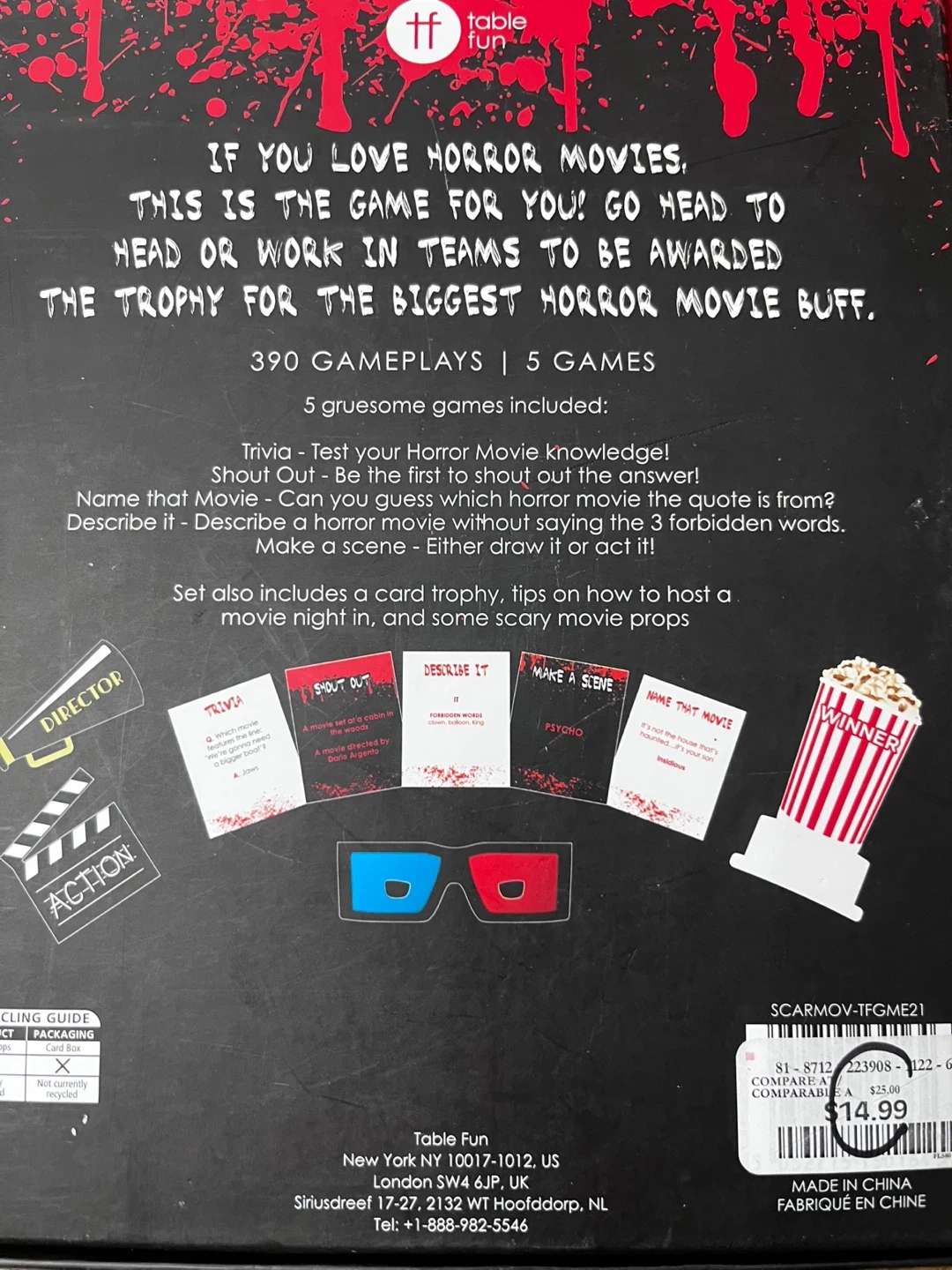 - Scary Movie Night In: The ultimate horror movie game set with trivia and charades. Opened. $10