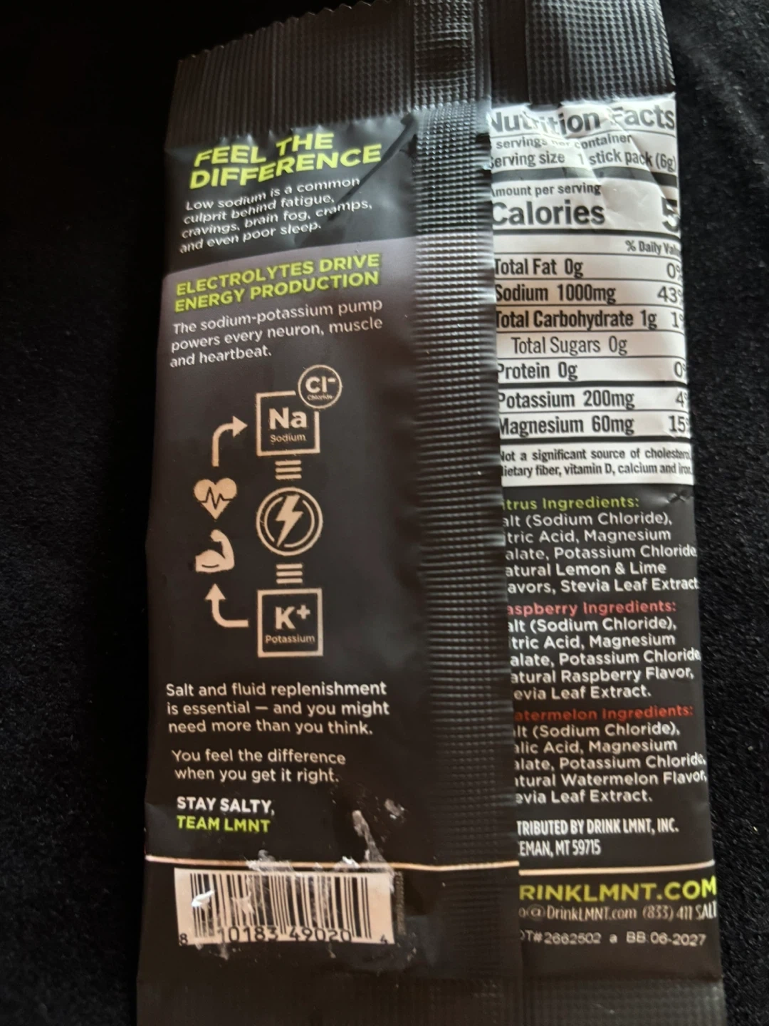 Selling a variety pack of LMNT electrolyte drink mix. This zero-sugar hydration mix contains 1000mg sodium, 200mg potassium, and 60mg magnesium per serving. It's great for replenishing electrolytes and staying hydrated! Stay salty, team LMNT