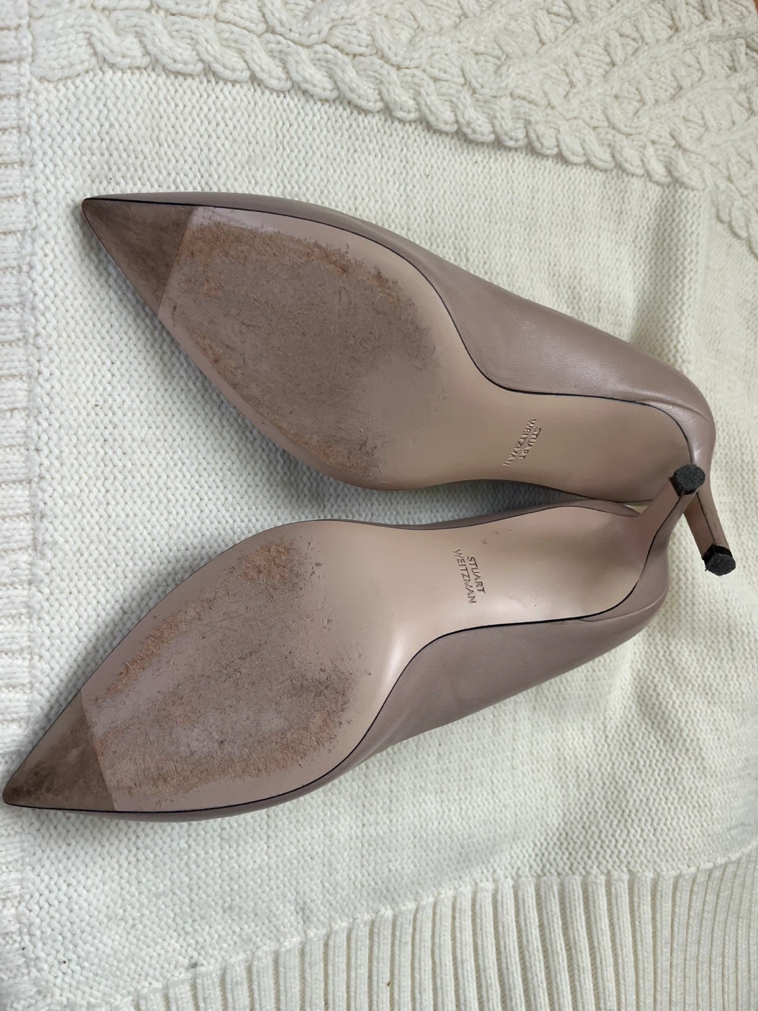 Stuart Weitzman beige pointed 3 inch heels. Leather interior, exterior, and soul. Bottom of both heels have some scrapes, otherwise in great condition. Simple and elegant shoe. Open to other meeting locations within-up locations within reason.