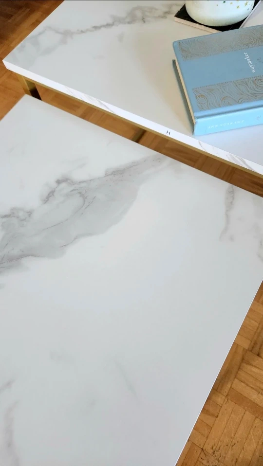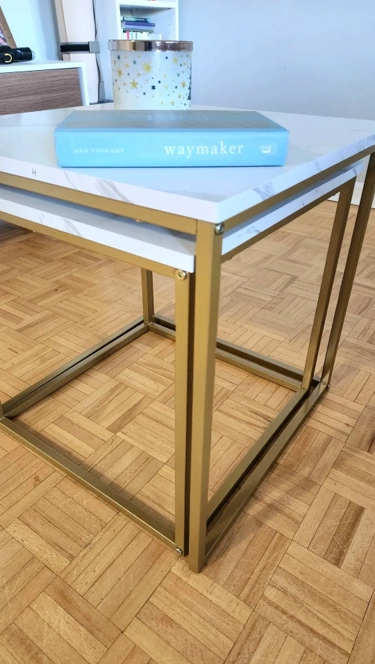 This coffee or side table set is brand new and already assembled, no damage or scratch. It's made of wooden tabletop with a marble finish, in perfect condition and already assembled. The tables can be spread out or nested together to save space. The original price was $310 without assembly fee yet, so save $$ and time. Price is not negotiable, so please don't ask for a lower price. See dimensions in one of the pics.