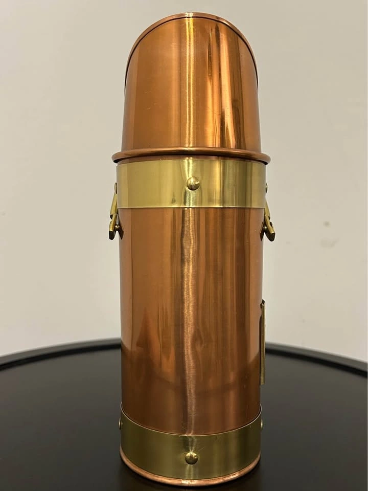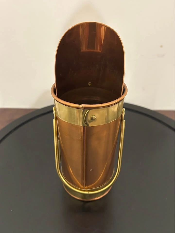 Elegant vintage copper & brass match holder, a beautiful accent piece for any refined fireplace setup. Warm polished copper combined with solid brass details gives it a timeless, high-end look. The angled top, brass handle, and front viewing window reflect classic 1970s–1980s craftsmanship. Marked Taiwan on the base.