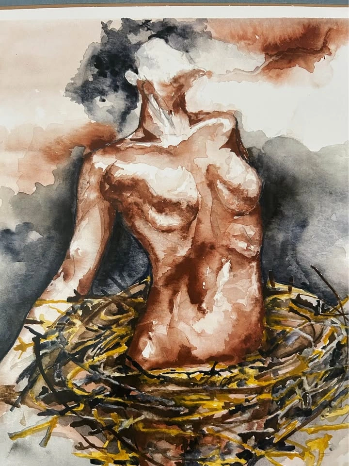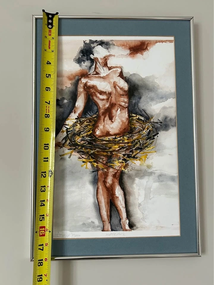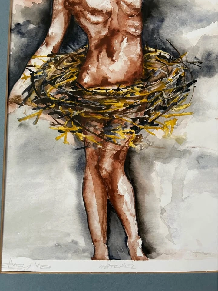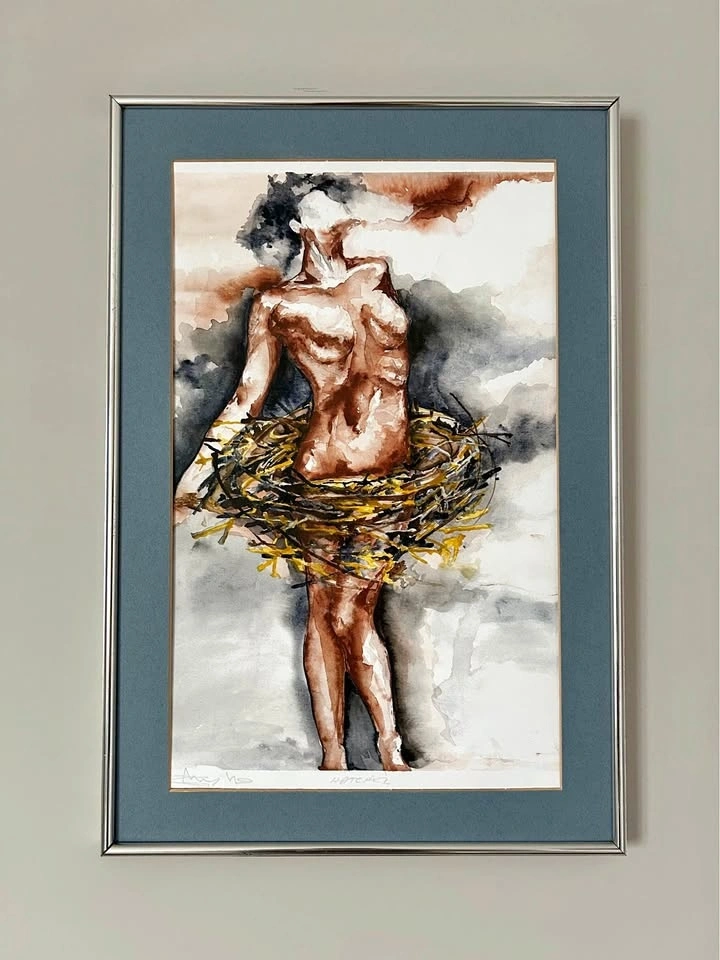 Striking contemporary art print “Hatched”, hand-signed by the artist in pencil. A powerful figurative composition with expressive brushwork and warm earthy tones, beautifully contrasted with soft atmospheric greys. The piece carries a strong emotional presence and makes an excellent focal point for a modern home, studio, or gallery-style interior.