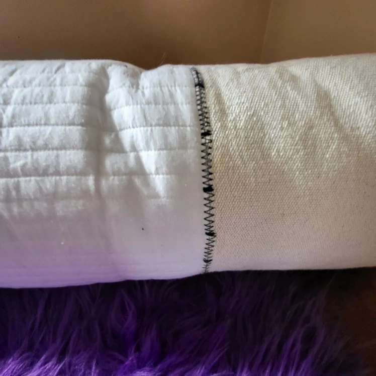 It has a unique design with stitching on one side and a contrasting fabric on the other. Perfect for adding a touch of style to your home decor