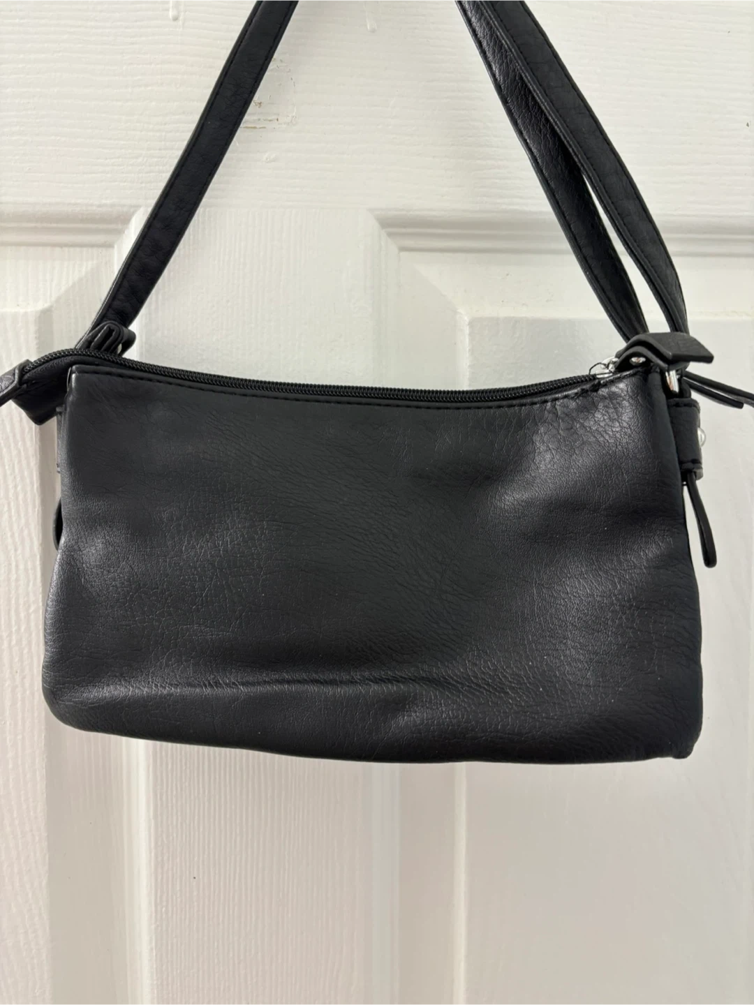 This is a black crossbody bag from Denver Hayes. It has a zipper closure and a front pocket with a zipper. The interior lining has a paisley pattern.