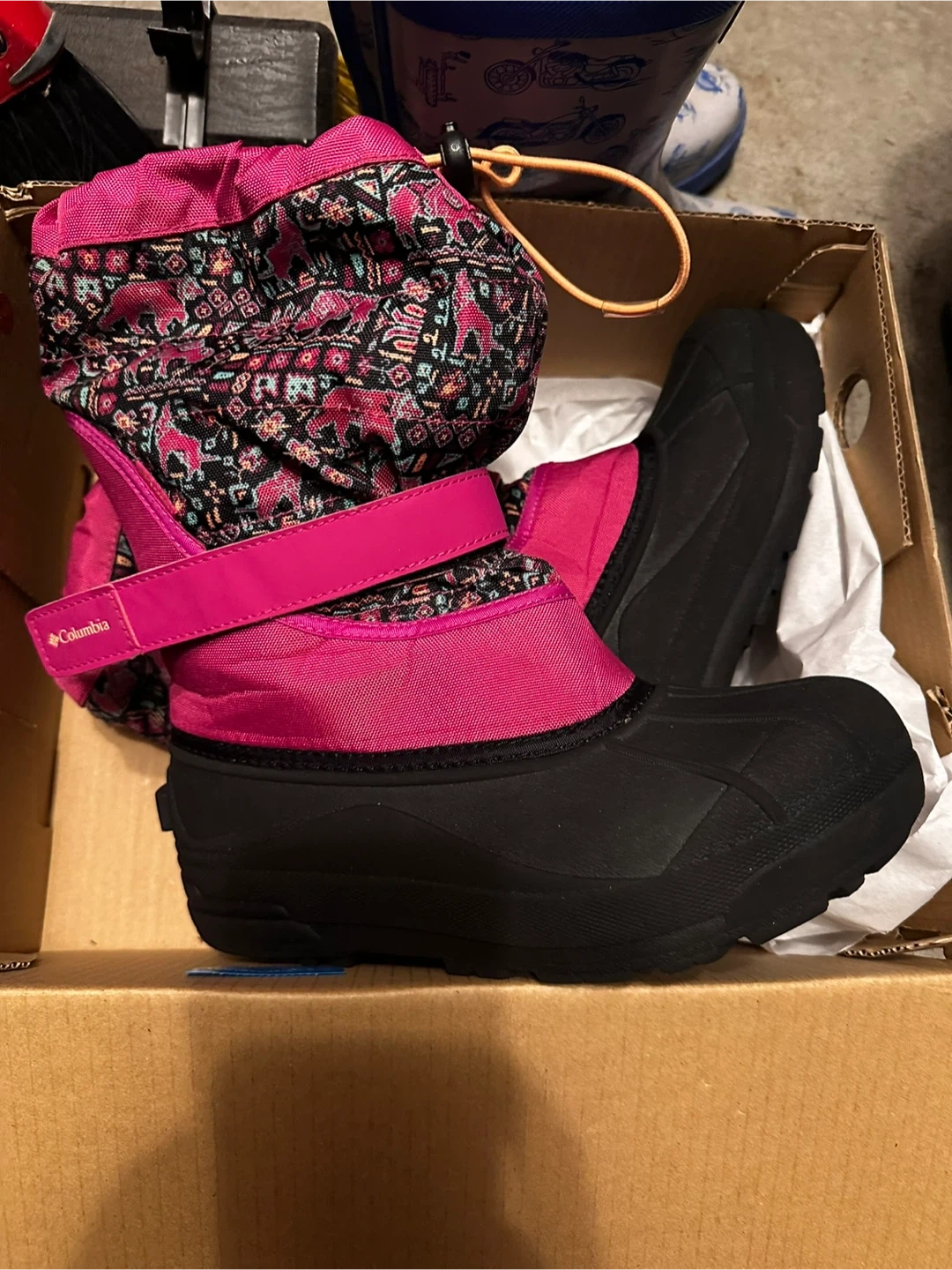 Selling a pair of Columbia kids' snow boots in size 6. They come in a fun pink and black colour with a patterned design on the upper part of the boot. The boots are in good condition and come with the original box.