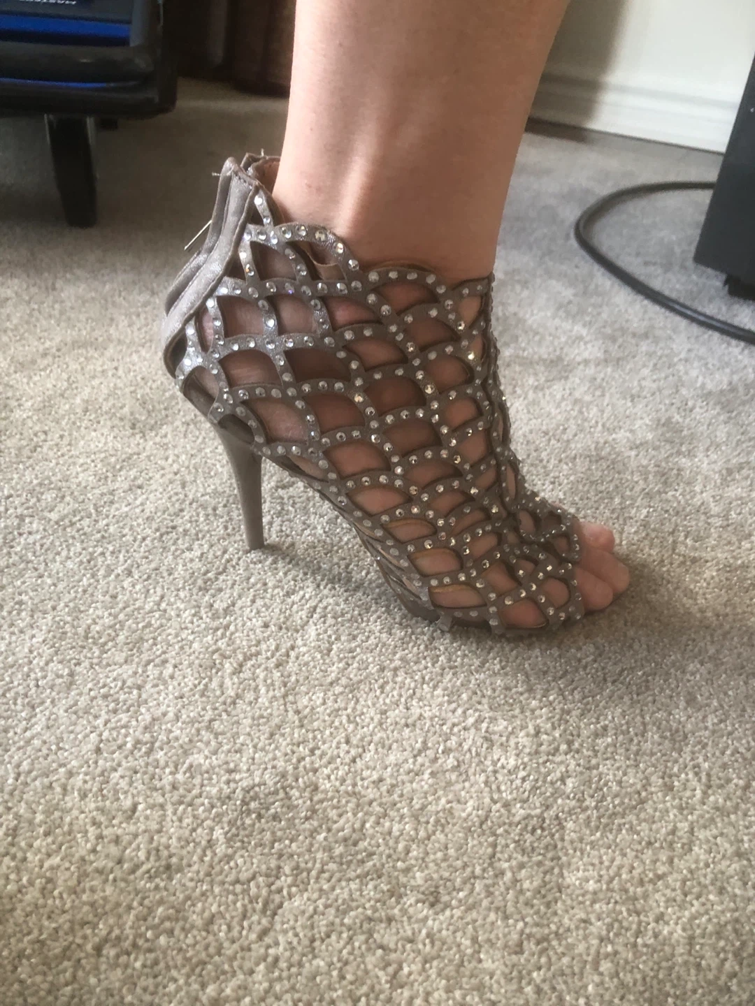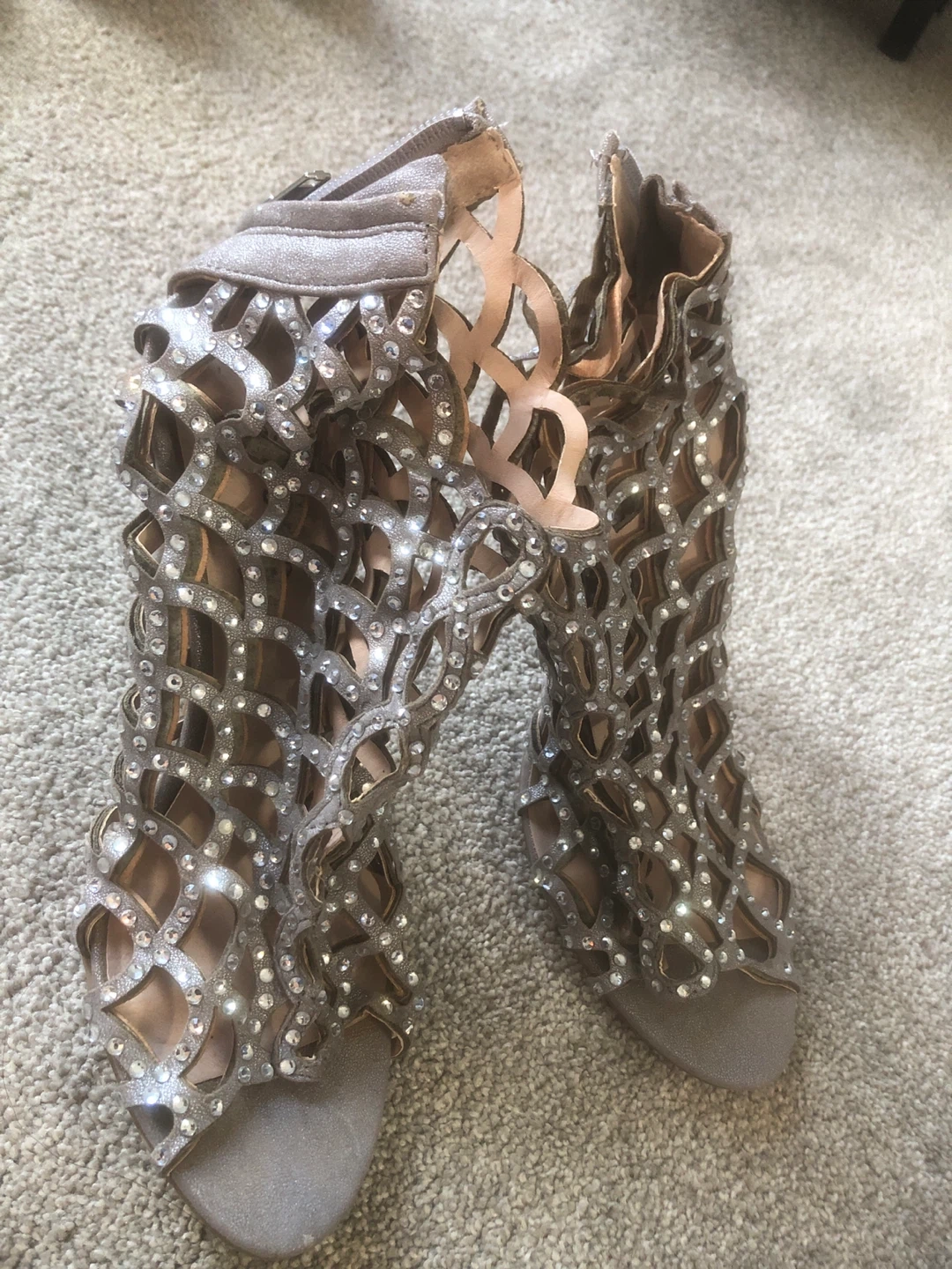 These are a pair of stylish cage heels with rhinestone detailing. They have a zipper in the back. They have a high heel and an open toe. They are in good condition!