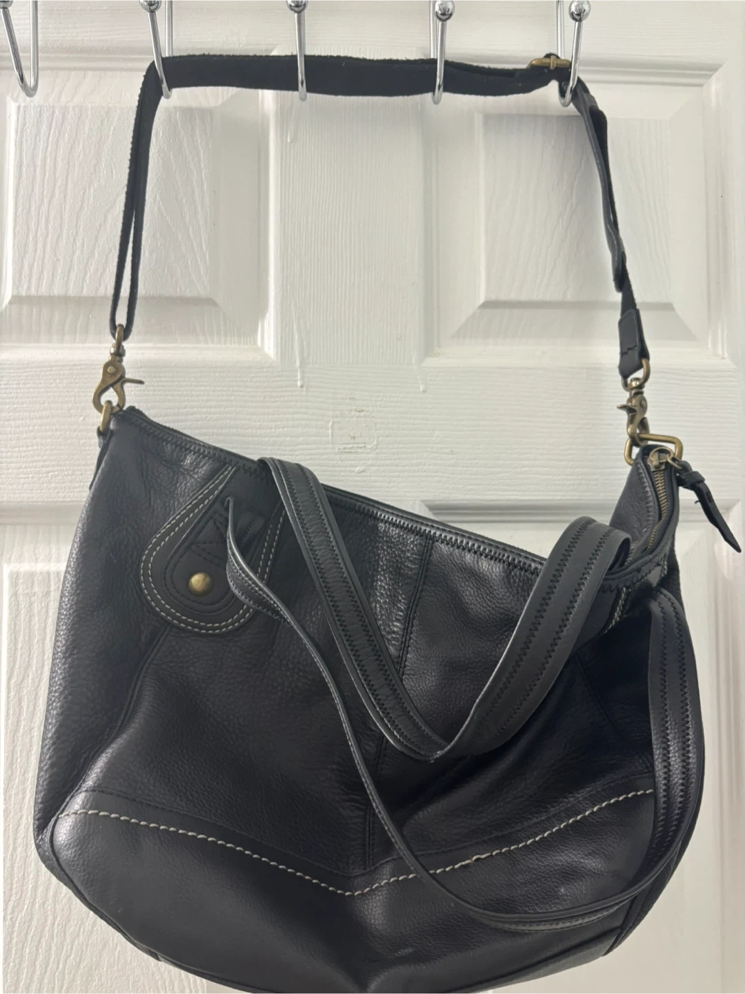 The Sak Shoulderbag Satchel Black Leather Purse / Large weekender Handbag. It's in great condition. The bag features a zipper closure and an adjustable shoulder strap. Currently sold elsewhere for $120 CAD.