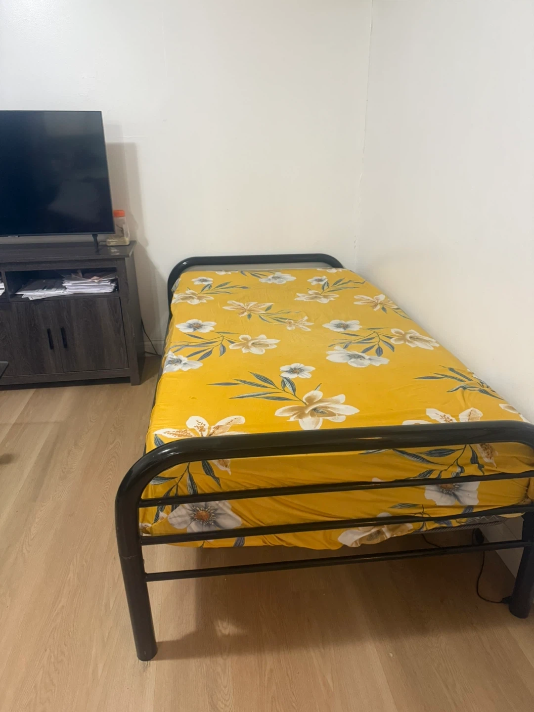 Selling a single bed frame that's perfect for a small space or a kid's room. It comes with a fun floral-patterned mattress. The frame is sturdy and in good condition. It's ready for a new home!