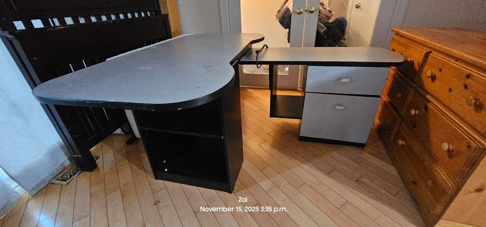 Selling a black L-shaped desk. It's in good condition and has plenty of workspace. Perfect for a home office or gaming setup! It has drawers and shelves for storage