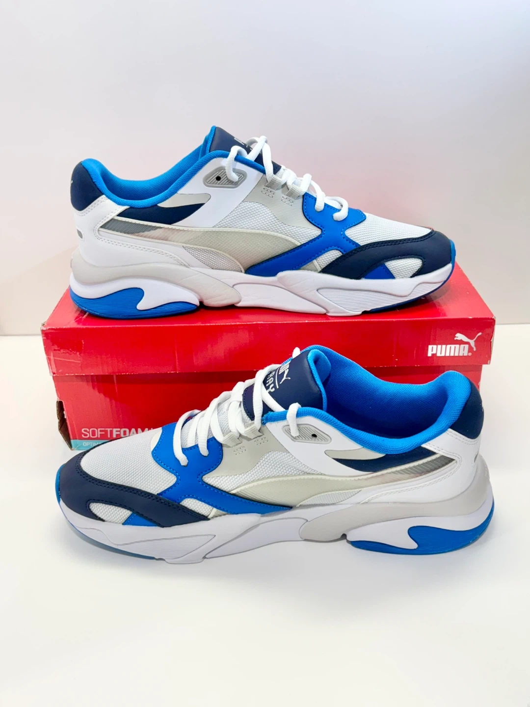 Selling a pair of Puma X-Ray Millennium men's sneakers in size 10.5 . They feature a classic design with a mix of white, blue, and navy accents. The shoes have SOFTFOAM+ insoles for optimal comfort.