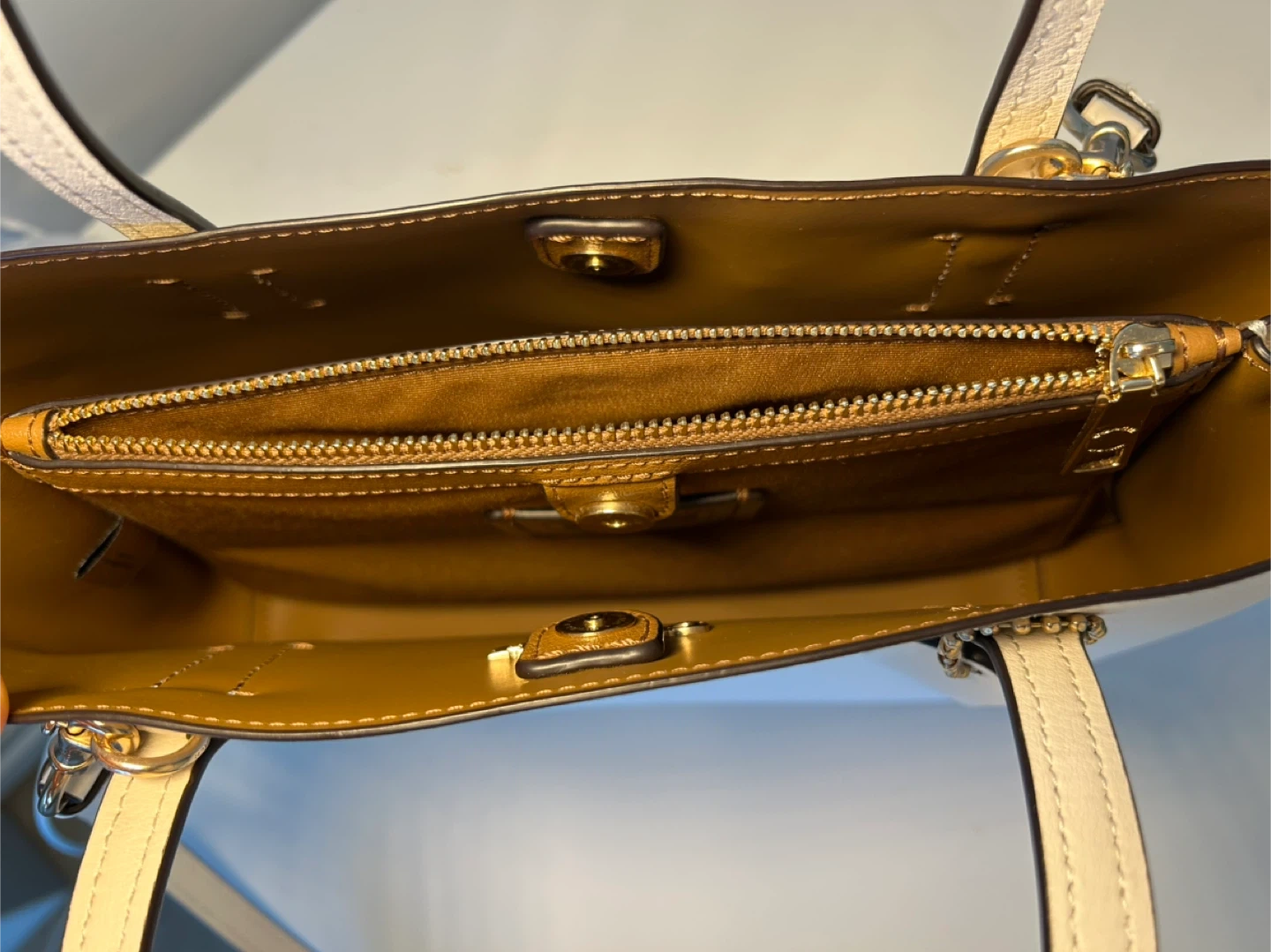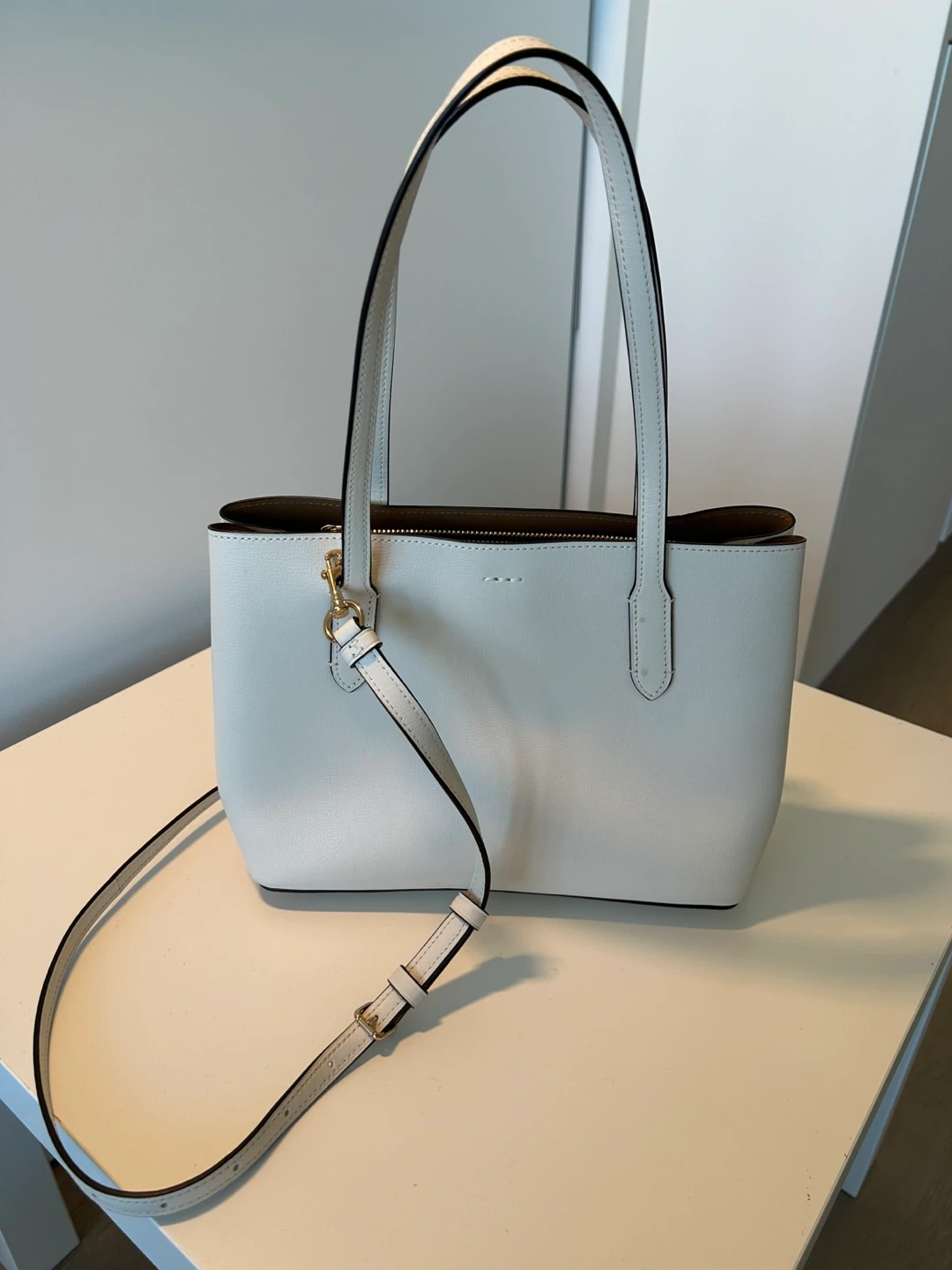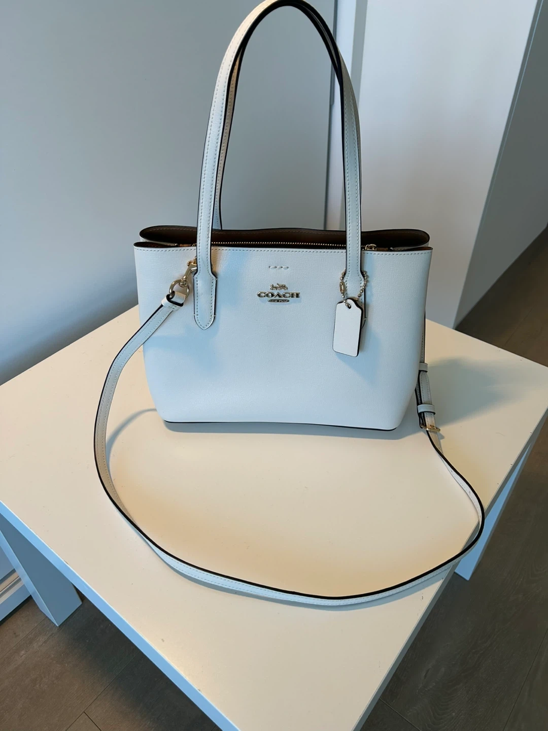 Selling a Coach tote bag in a lovely white leather. It's in great condition and perfect for everyday use! The interior has a convenient zippered pocket.