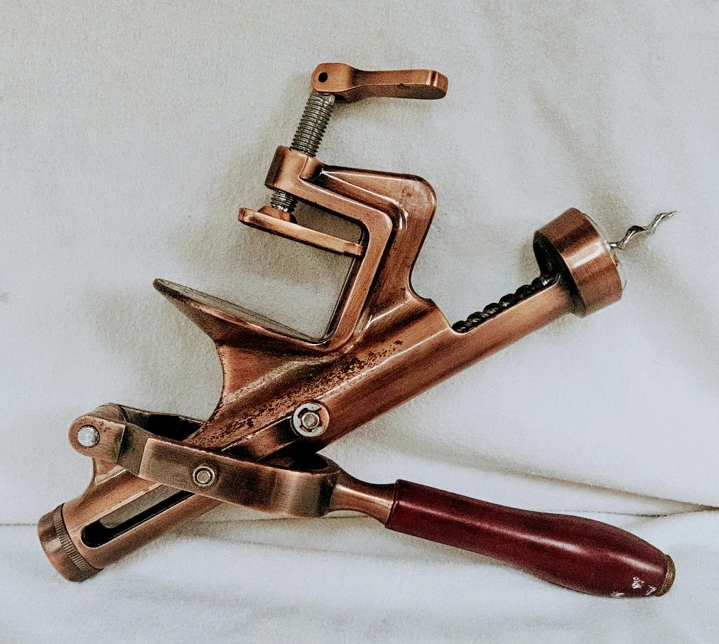 This vintage RAPID brass shelf and table mounted corkscrew wine opener features a solid oak handle along with a easy to adjust bar mount that clamps onto countertop or table.