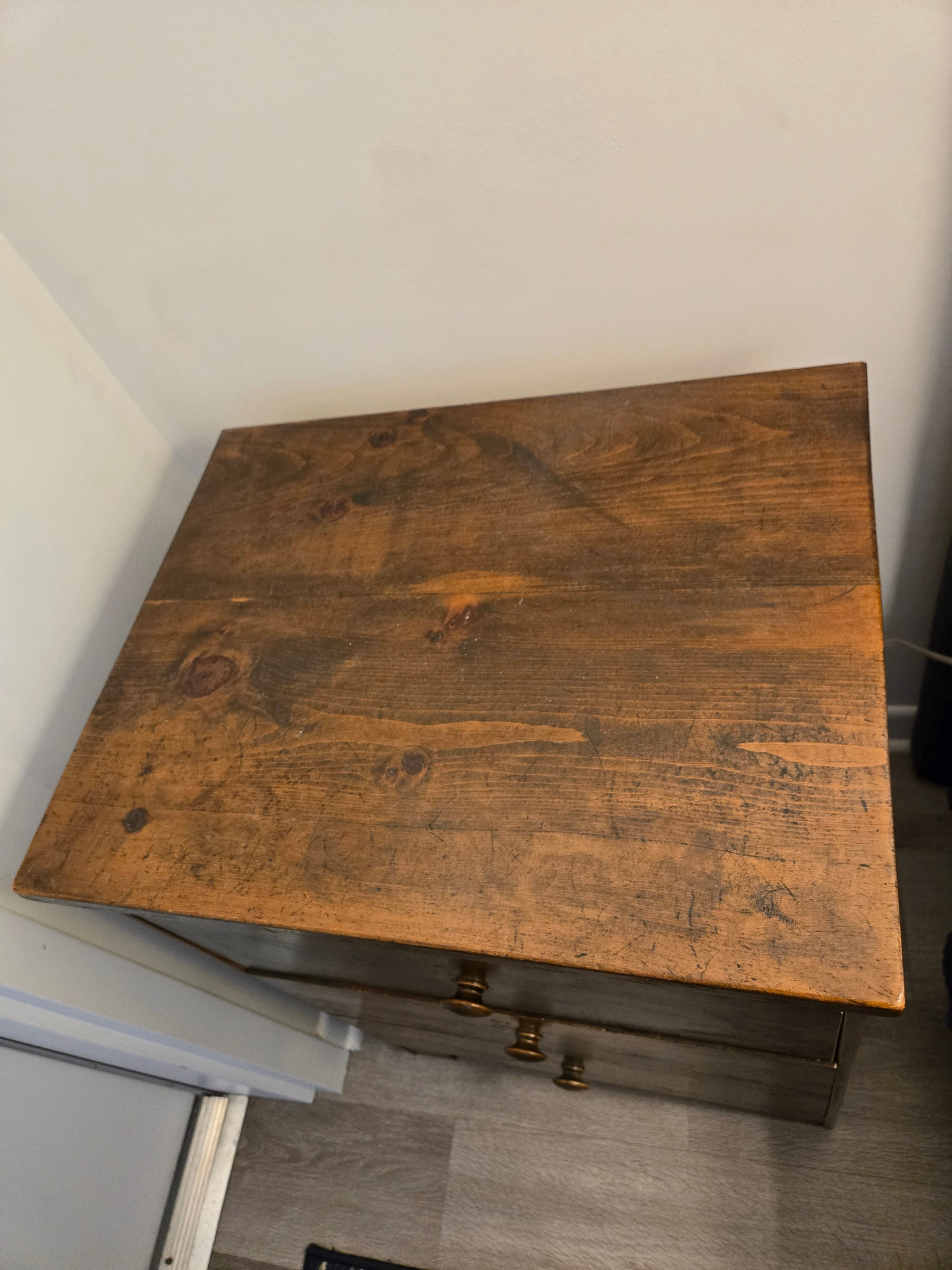 Selling a set of 2 vintage-style dark wood bedside tables with 3 drawers each. Ample storage space for any bedroom. One drawer handle is missing on the third drawer, but it’s an easy fix. Stylish, functional, and full of character.
