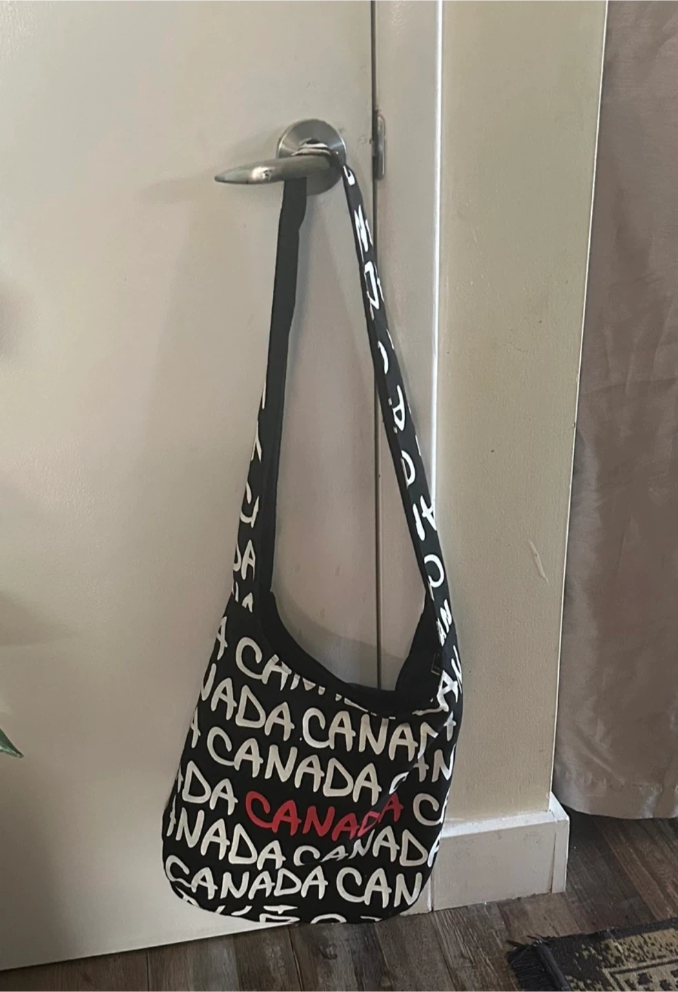 Stylish shoulder bag featuring a fun Canada print! The bag is black and white with the word 'CANADA' repeated all over, and some of the 'CANADA' are in red. Perfect for showing off your Canadian pride!