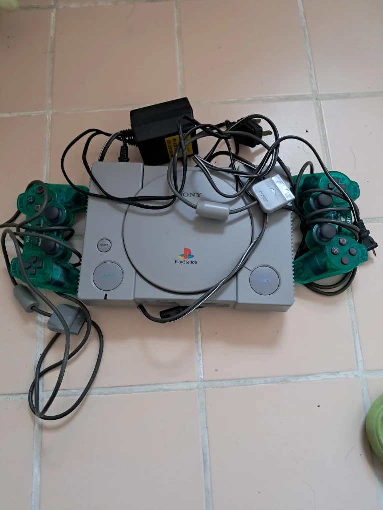 Selling a classic Sony Playstation console! It comes with two green controllers and the necessary power adapter to get you gaming right away. Perfect for reliving some retro fun or introducing a new generation to these classic games