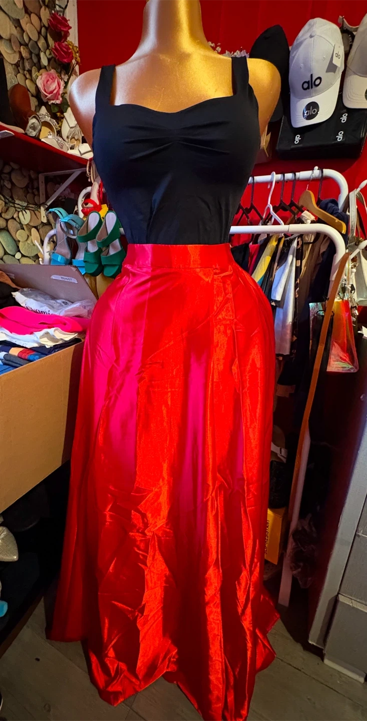 Here's a beautiful red satin skirt! It's in great condition and ready for a new wardrobe. The skirt has a lovely sheen and would be perfect for a special occasion or adding a pop of color to your everyday style