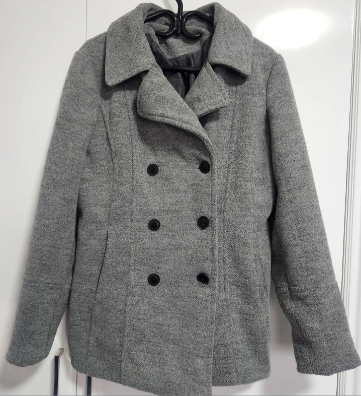 Selling a stylish grey pea coat! It's a wool blend with a double-breasted button closure, bought at Ross USA, worn few times only