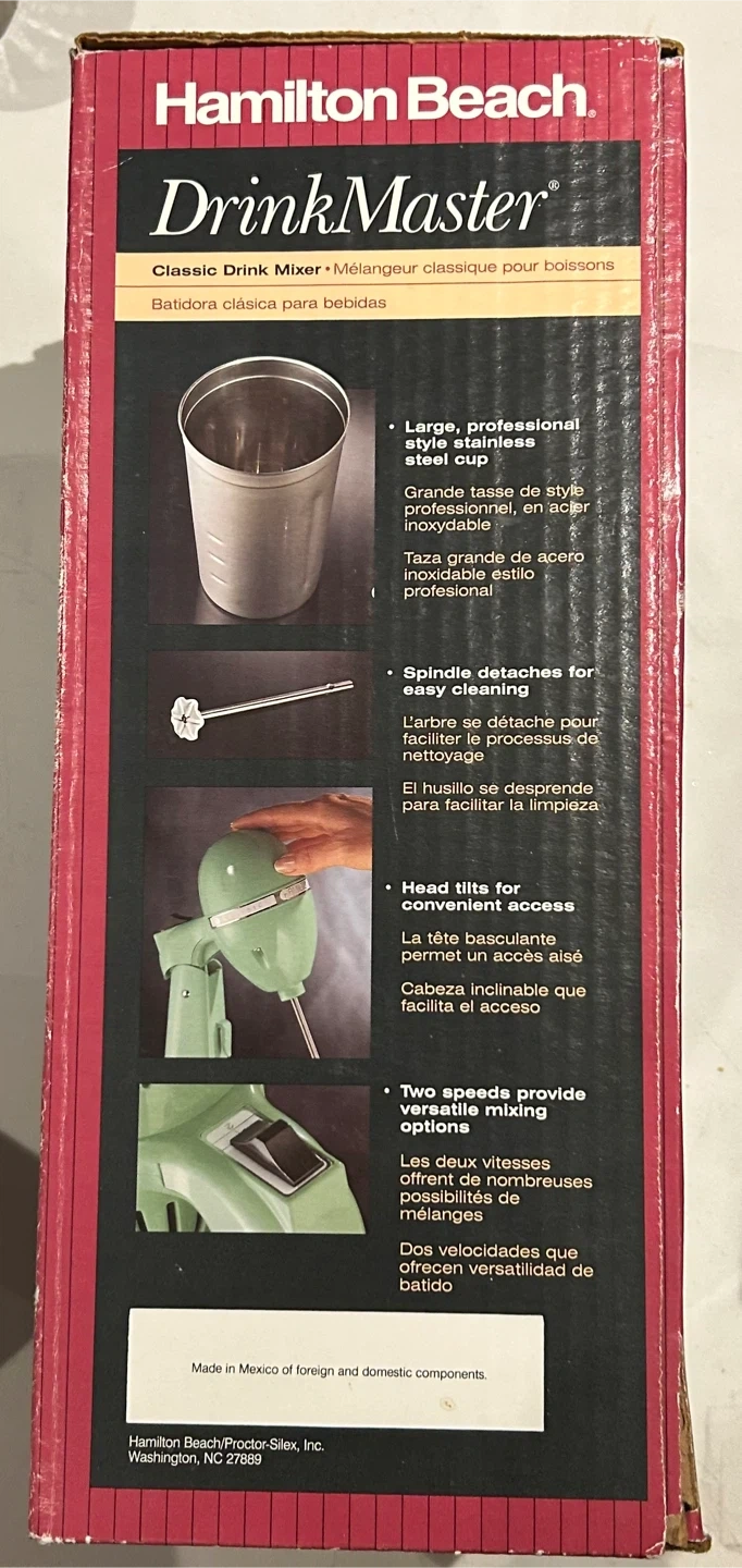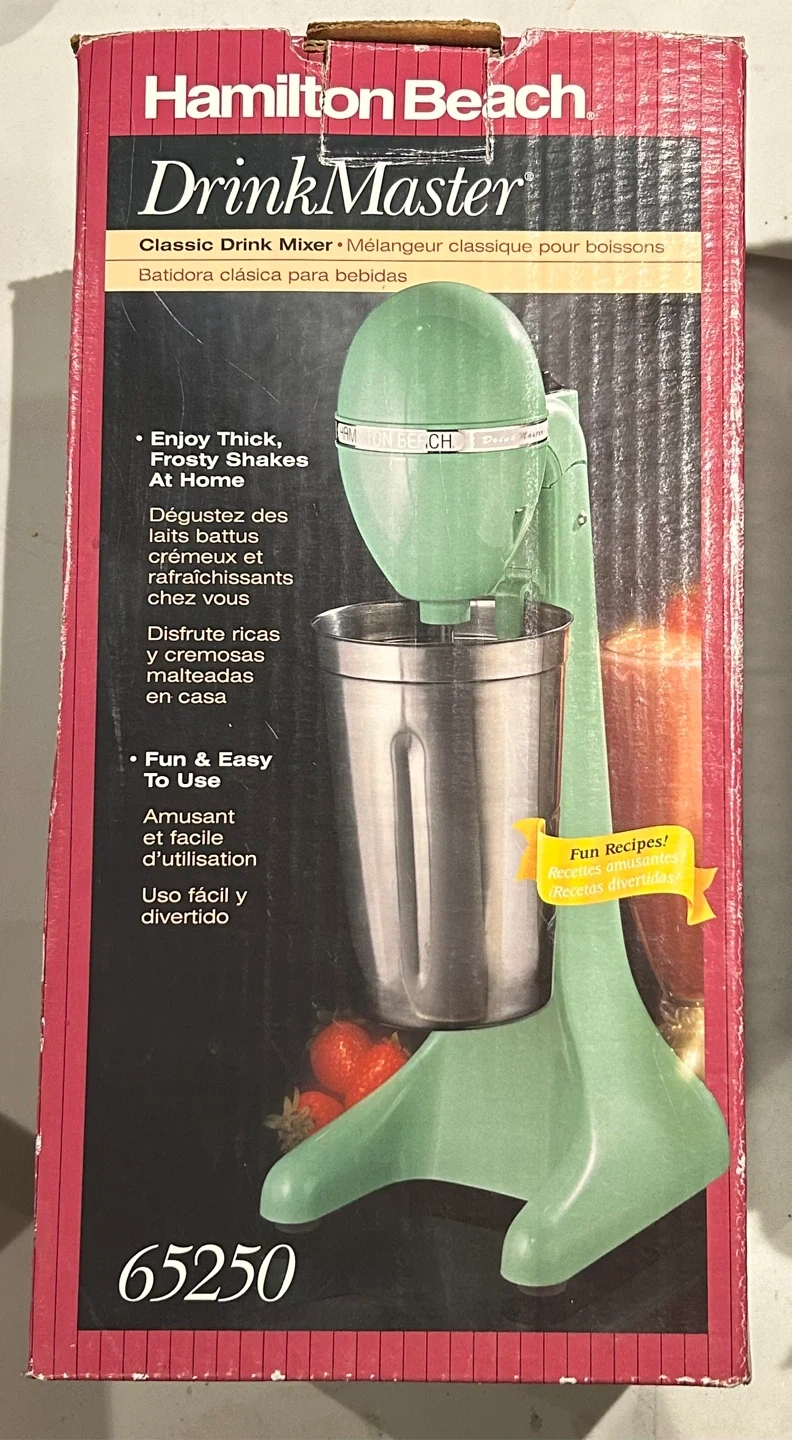 Selling a used but like new Hamilton Beach DrinkMaster Classic Drink Mixer! It's perfect for making thick, frosty shakes at home. It features a large, professional-style stainless steel cup and a spindle that detaches for easy cleaning. The head tilts for convenient access, and it has two speeds for versatile mixing options