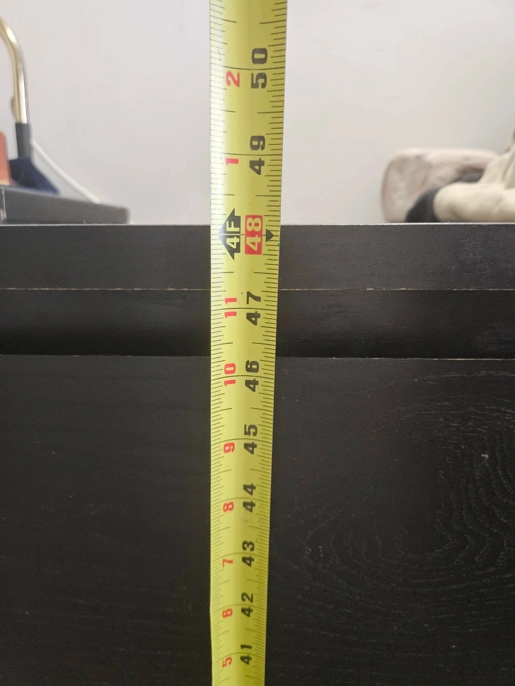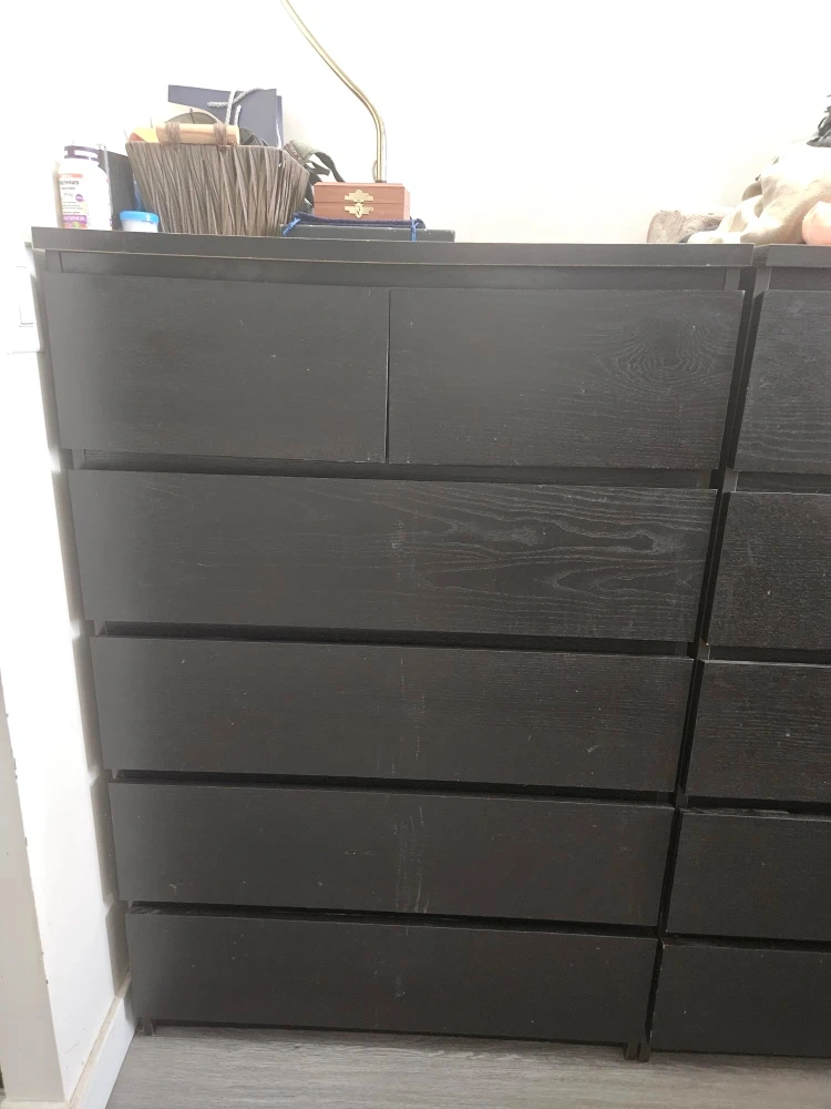 Selling a black dresser from IKEA. It has some scratches on the surface. The dresser is about 31 inches wide and 48 inches tall.