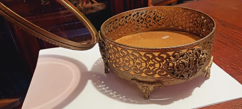 Selling a vintage vanity/dresser jewelry box with Amber glass lid. It features an ornate metal design with floral accents and orange velvet interior. Perfect for storing jewelry or small keepsakes!!! 6" diameter. 3" high. Excellent condition. ALL MY PRICES ARE NEGOTIABLE !!