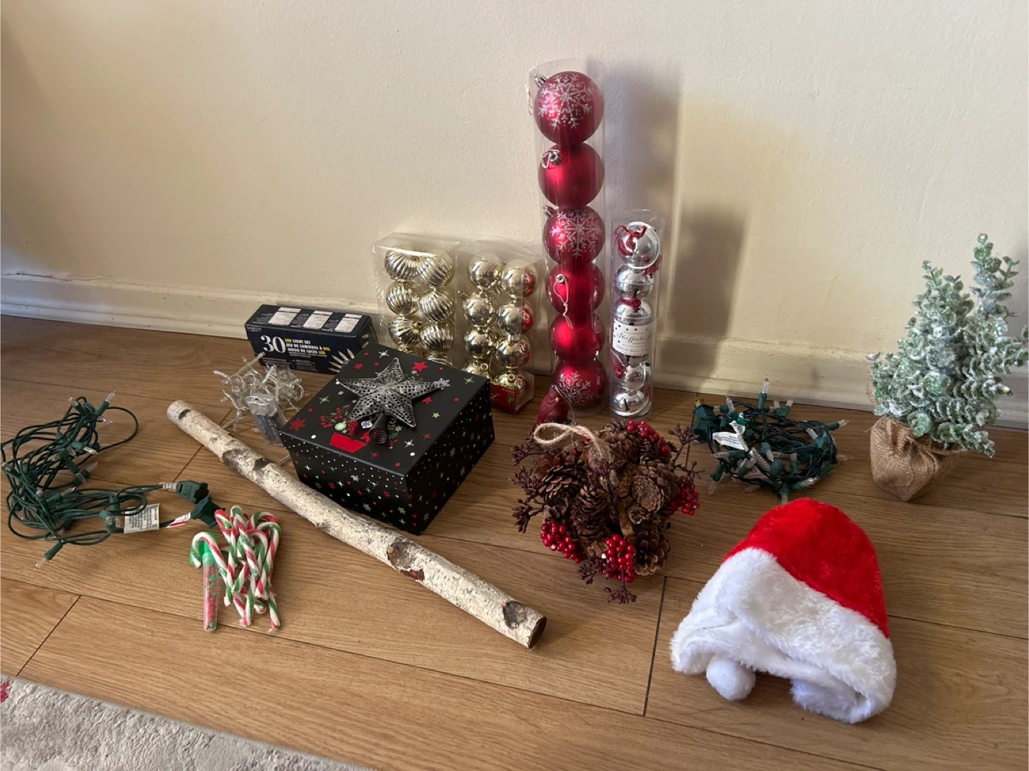 Selling a bundle of Christmas decorations, including a pine cone and berry ornament, a tree topper, a mini Christmas tree, baubles, lots of fairy lights, and other festive items! Perfect for adding some holiday cheer to your home.