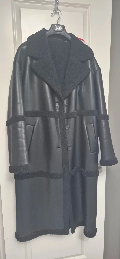 Here's a stylish black coat featuring faux leather with shearling trim! It's in great condition and ready to keep you warm during the colder months. The coat has a classic design with button closures.
