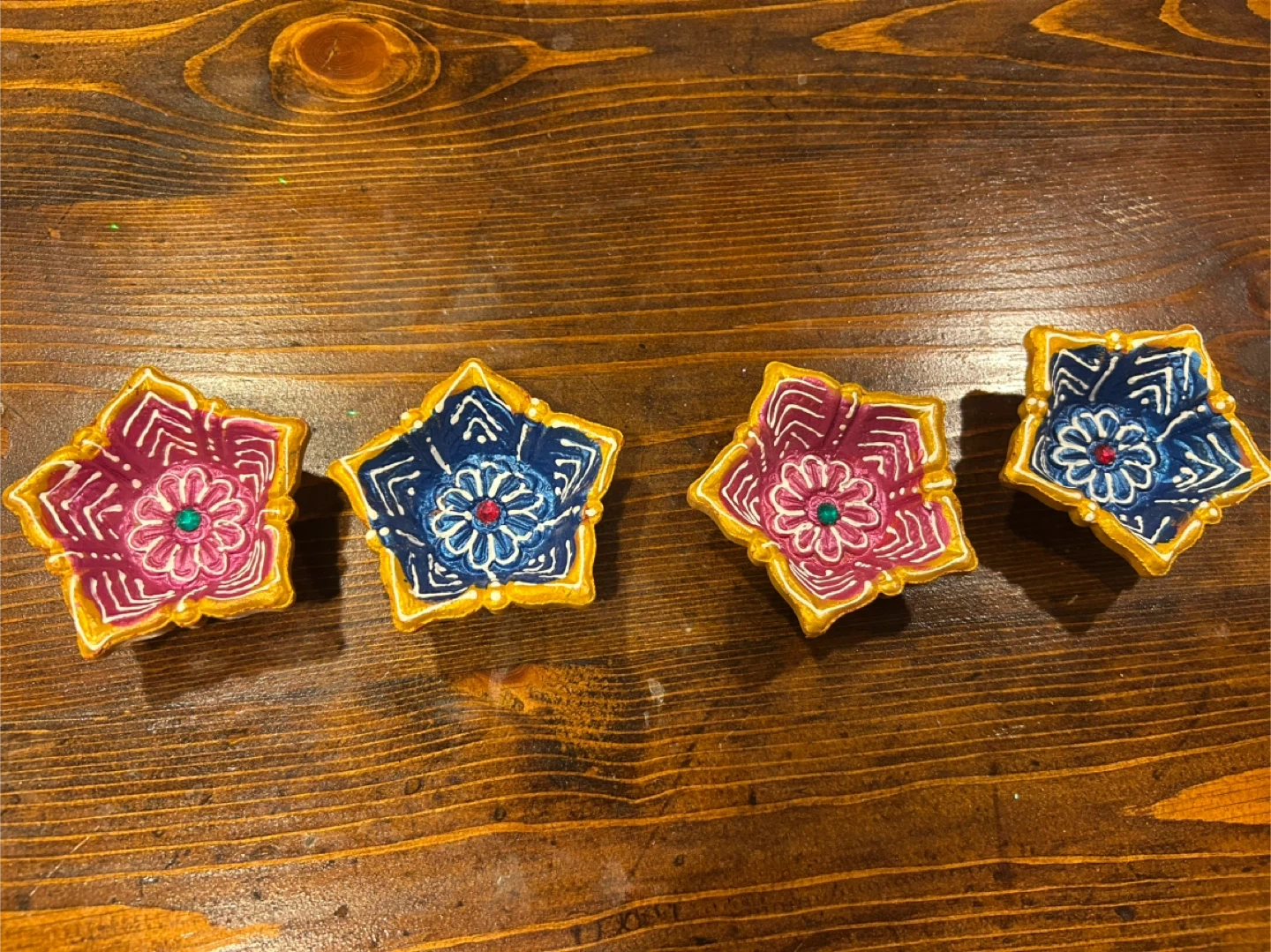 Selling a set of four decorative diyas, perfect for Diwali or any festive occasion! They're in great condition and feature intricate floral designs in pink and blue with a golden trim