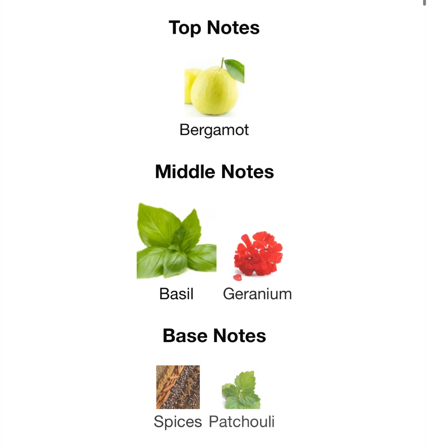 Top note is Bergamot; middle notes are Basil and Geranium; base notes are Spices and Patchouli