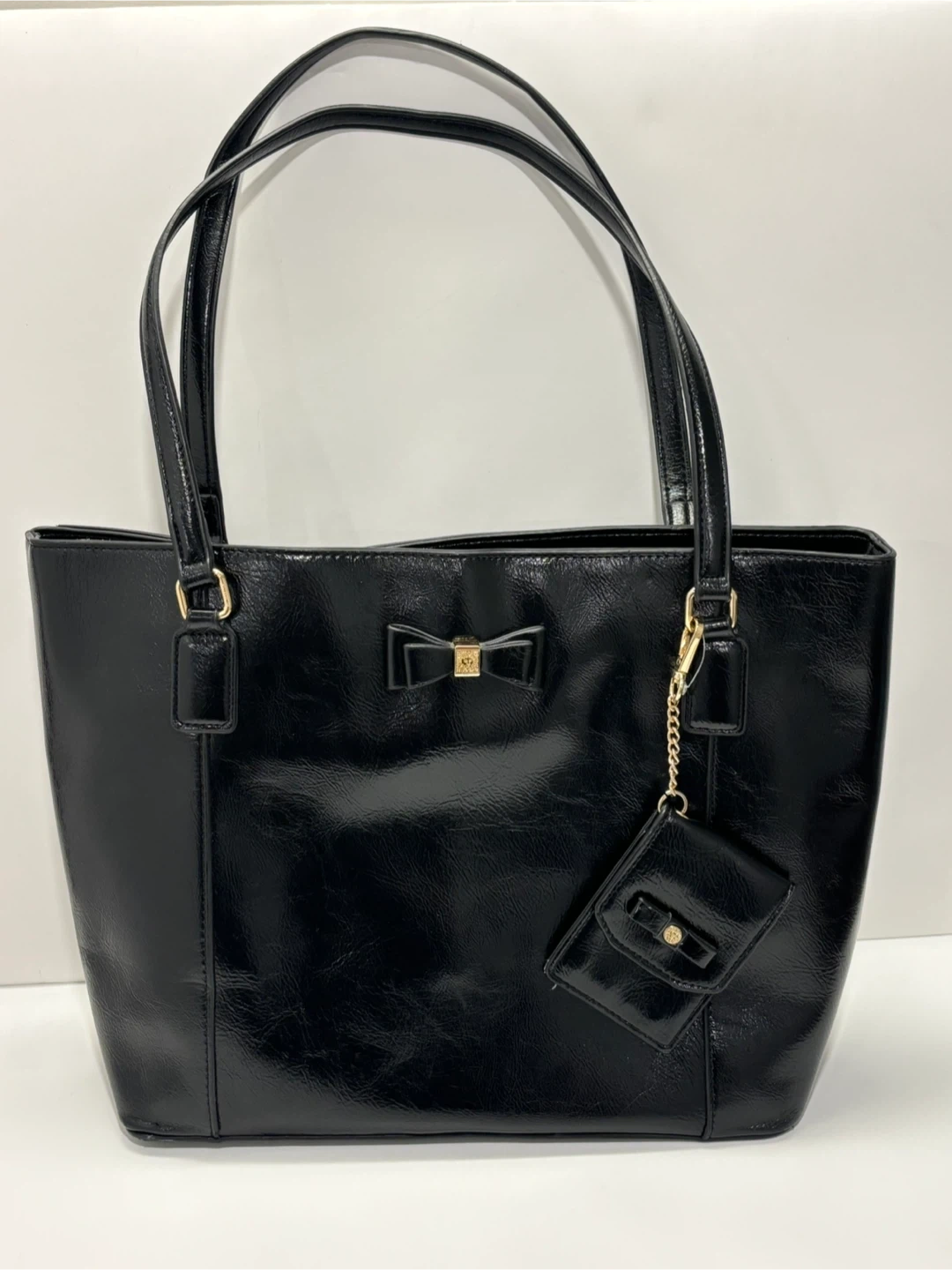Anne Klein tote bag in black. It's a stylish and functional bag perfect for everyday use. The bag has a bow detail on the front and also includes a detachable cardholder. The interior lining features the Anne Klein logo. It is in great condition!