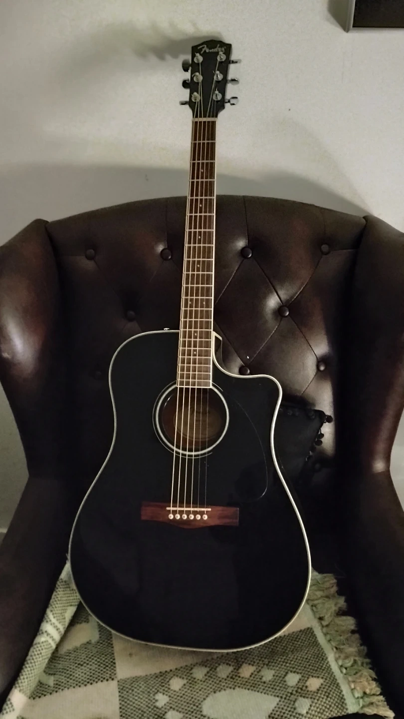 This is a Fender CD-140SCE BLK acoustic guitar. It features a cutaway body for easier access to higher frets. Six steel strings are included. It's a great instrument for learning or playing.