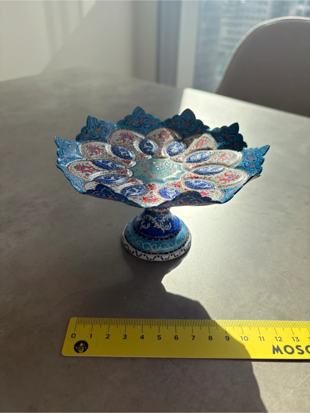 Beautiful hand-painted decorative pedestal bowl featuring intricate Persian-style floral and geometric patterns in blue, red, and gold. Perfect as a centerpiece, candy dish, or decorative accent. Compact size makes it great for shelves or coffee tables.