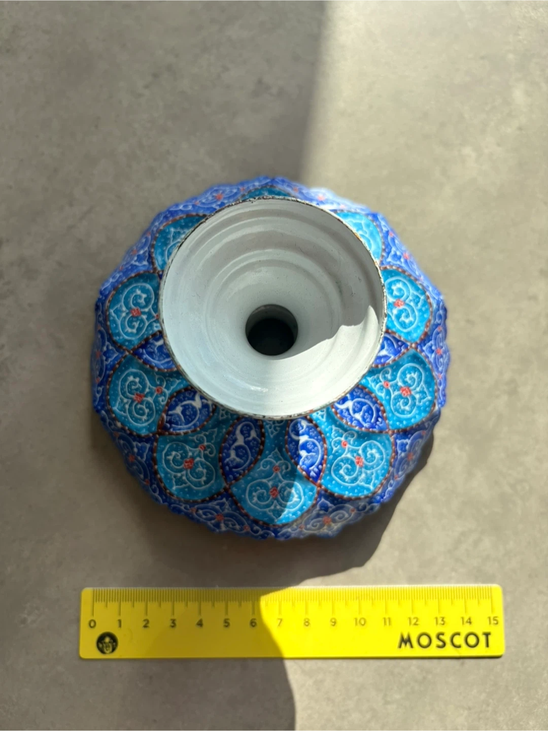 Beautiful hand-painted decorative pedestal bowl featuring intricate Persian-style floral and geometric patterns in blue, red, and gold. Perfect as a centerpiece, candy dish, or decorative accent. Compact size makes it great for shelves or coffee tables.