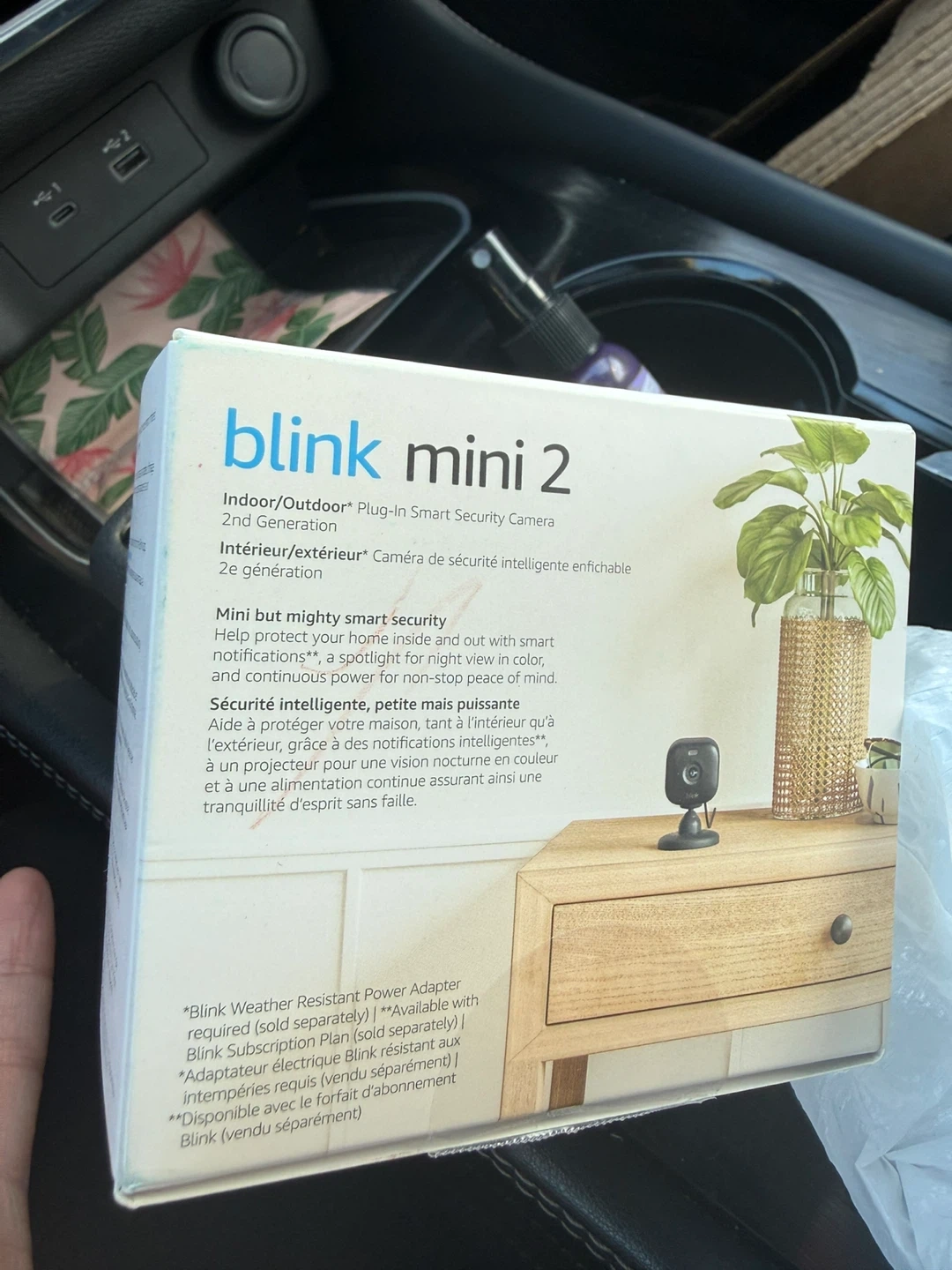 This is the Blink Mini 2 smart security camera. It offers HD Day + Night view and two-way audio. It also has an LED spotlight and is weather resistant. Smart notifications are included, and it works with Alexa!