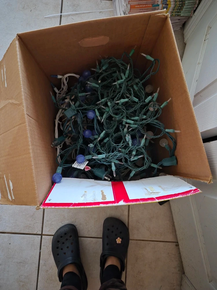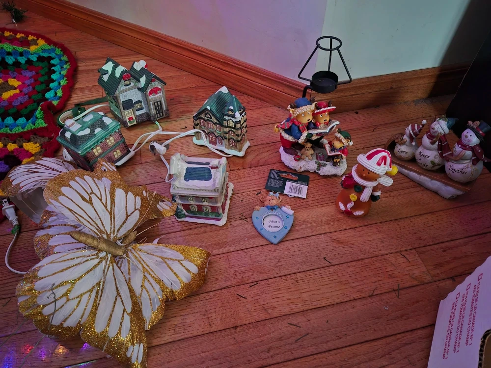 Christmas village houses, assorted decor items and some lights. Lights are mostly blue, not all work great. Might need fixing if you know how.