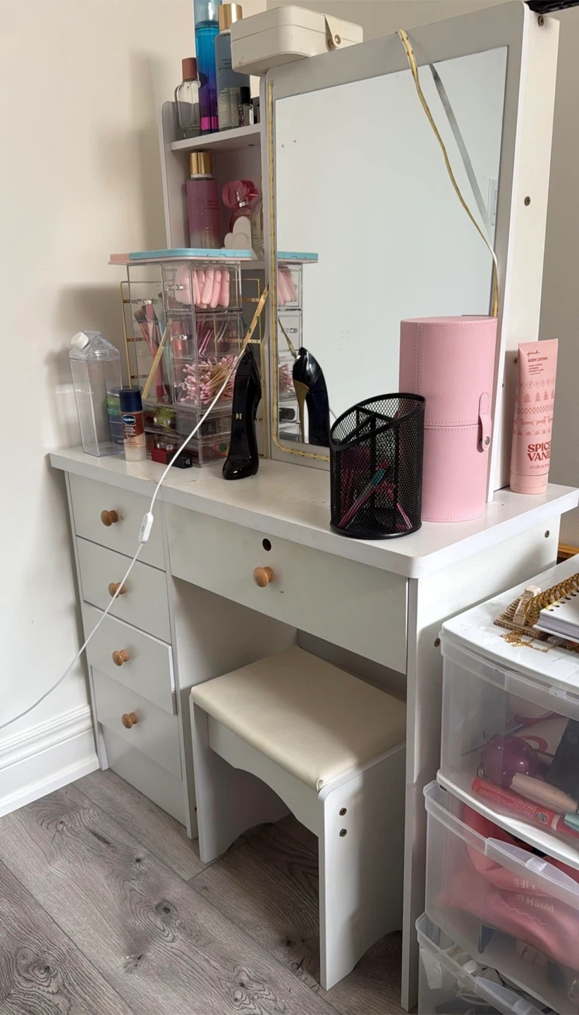 Selling a stylish white vanity table. It's perfect for getting ready and adding a touch of elegance to your space. It features drawers and shelves for all your makeup and accessories.
