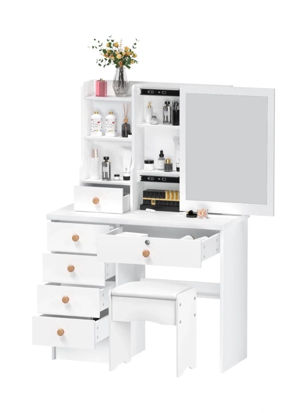 Selling a stylish white vanity table. It's perfect for getting ready and adding a touch of elegance to your space. It features drawers and shelves for all your makeup and accessories.