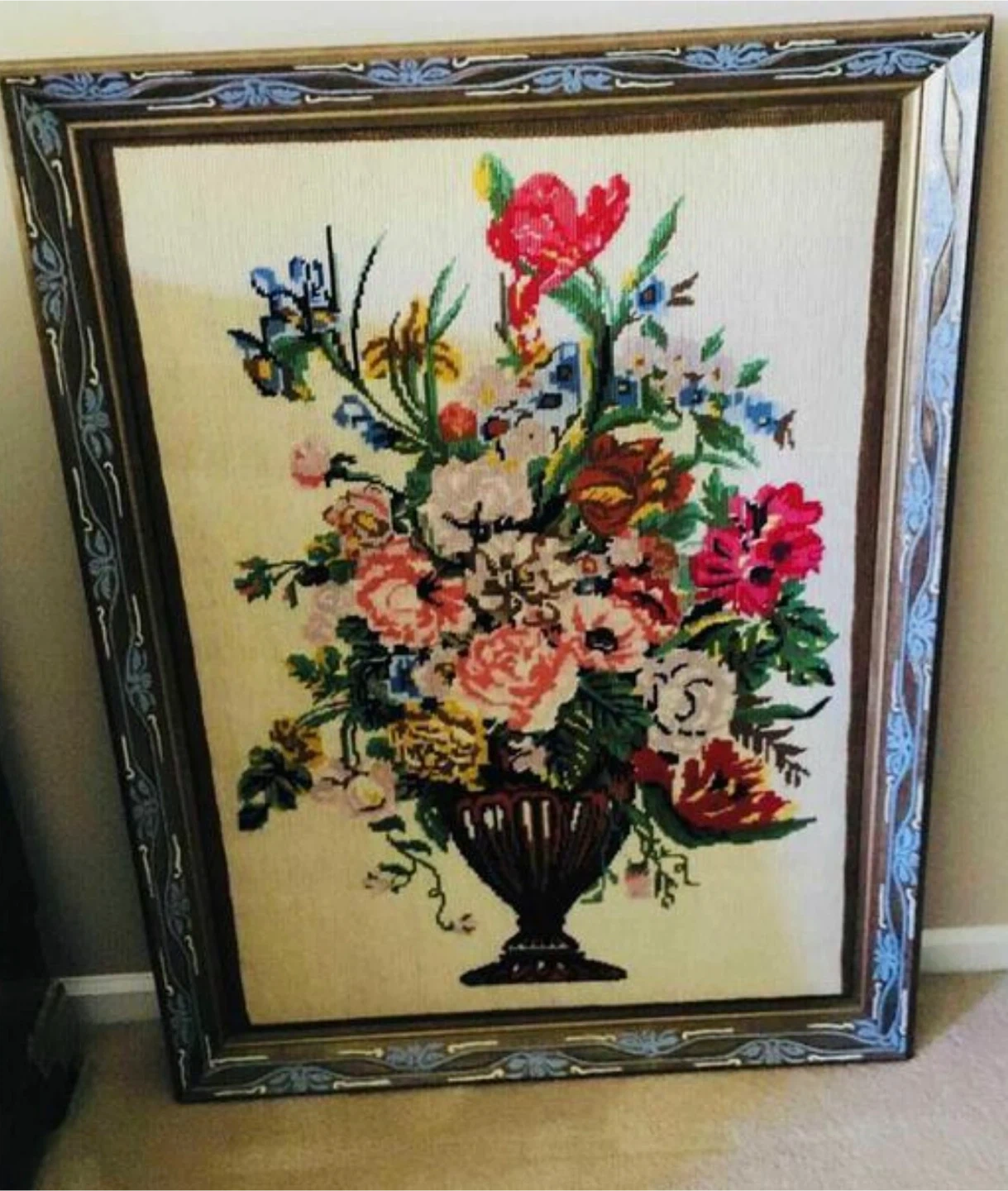 Selling an exquisitely lovely frame with floral needlepoint art! It features a beautiful arrangement of colourful flowers in a vase. This piece would add a touch of charm to any room