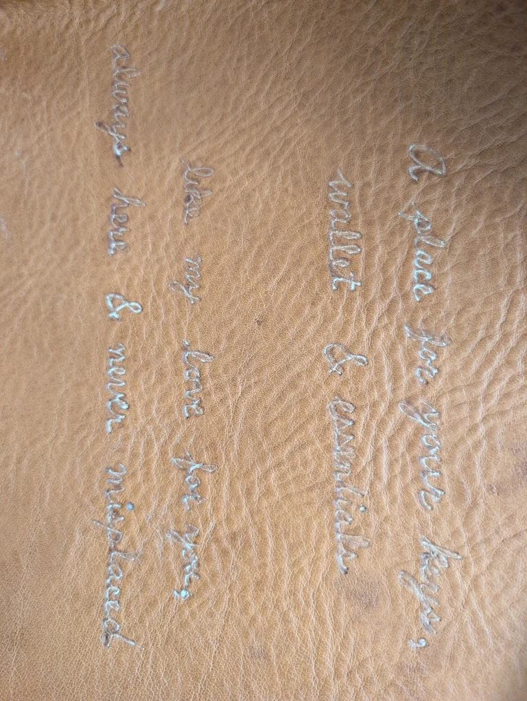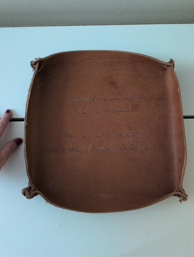 Selling a leather valet tray. It has a place for your keys, wallet, and essentials. The tray also has the phrase "A place for your keys, wallet & essentials like my love for you, always here & never misplaced" engraved on it.It was a gift from someone and we're no longer together. I never used it.