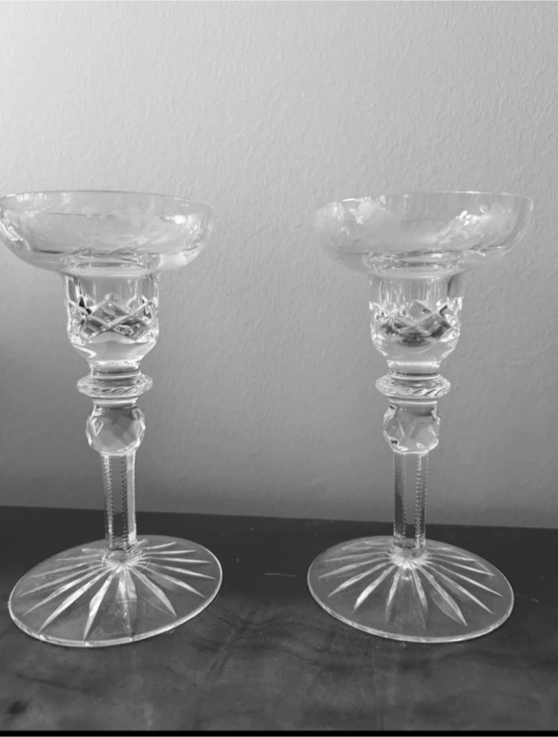 Selling a set of two beautiful crystal candlestick holders. They are in great condition and would look lovely on any table or mantle. The intricate design catches the light beautifully, adding a touch of elegance to any room