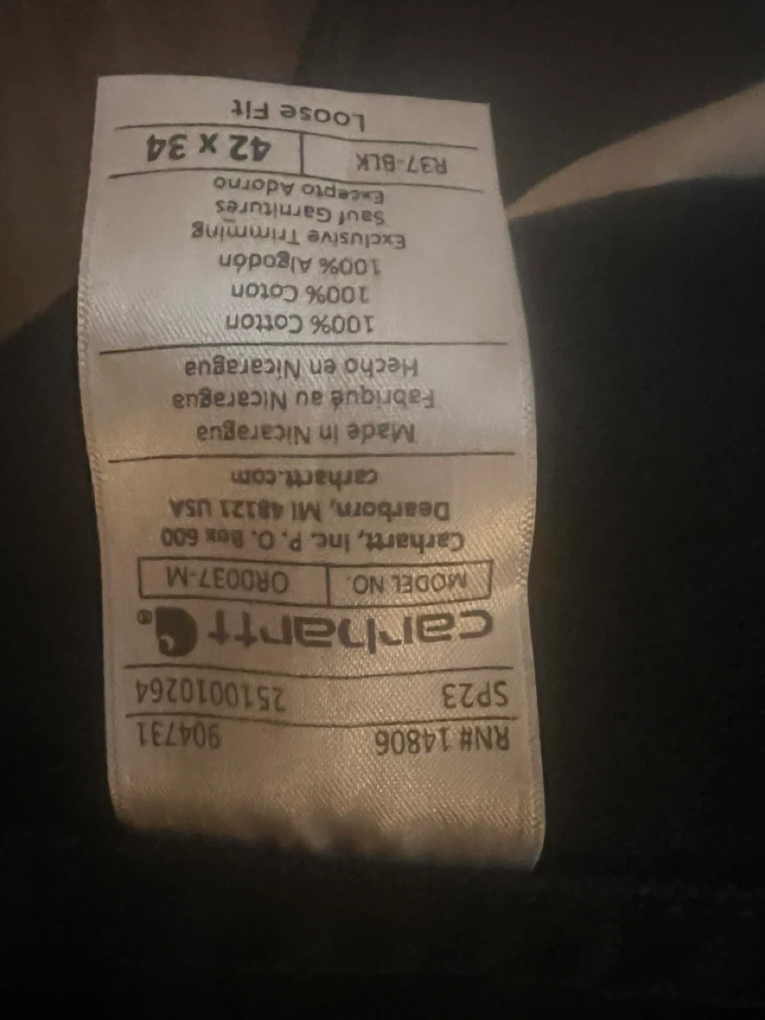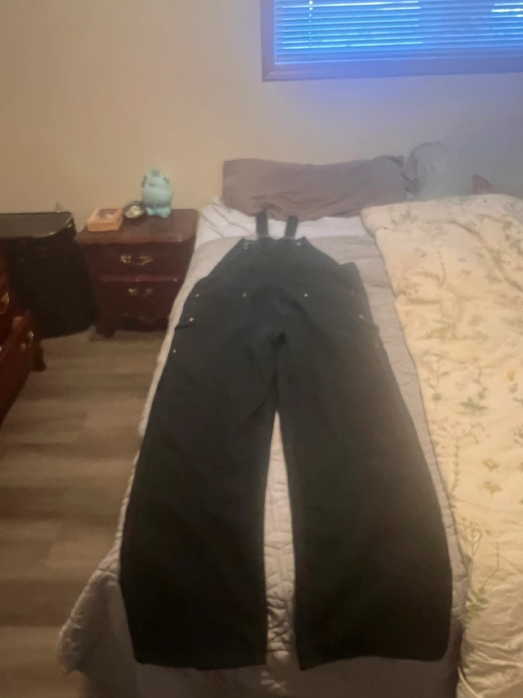 Selling a pair of Carhartt bib overalls in size 42x34. They are a loose fit and made of 100% cotton. The model number is OR0037-M. Like new, worn twice, washed 3 times. Elastic is stretchy, zippers all work and buttons are all intact.