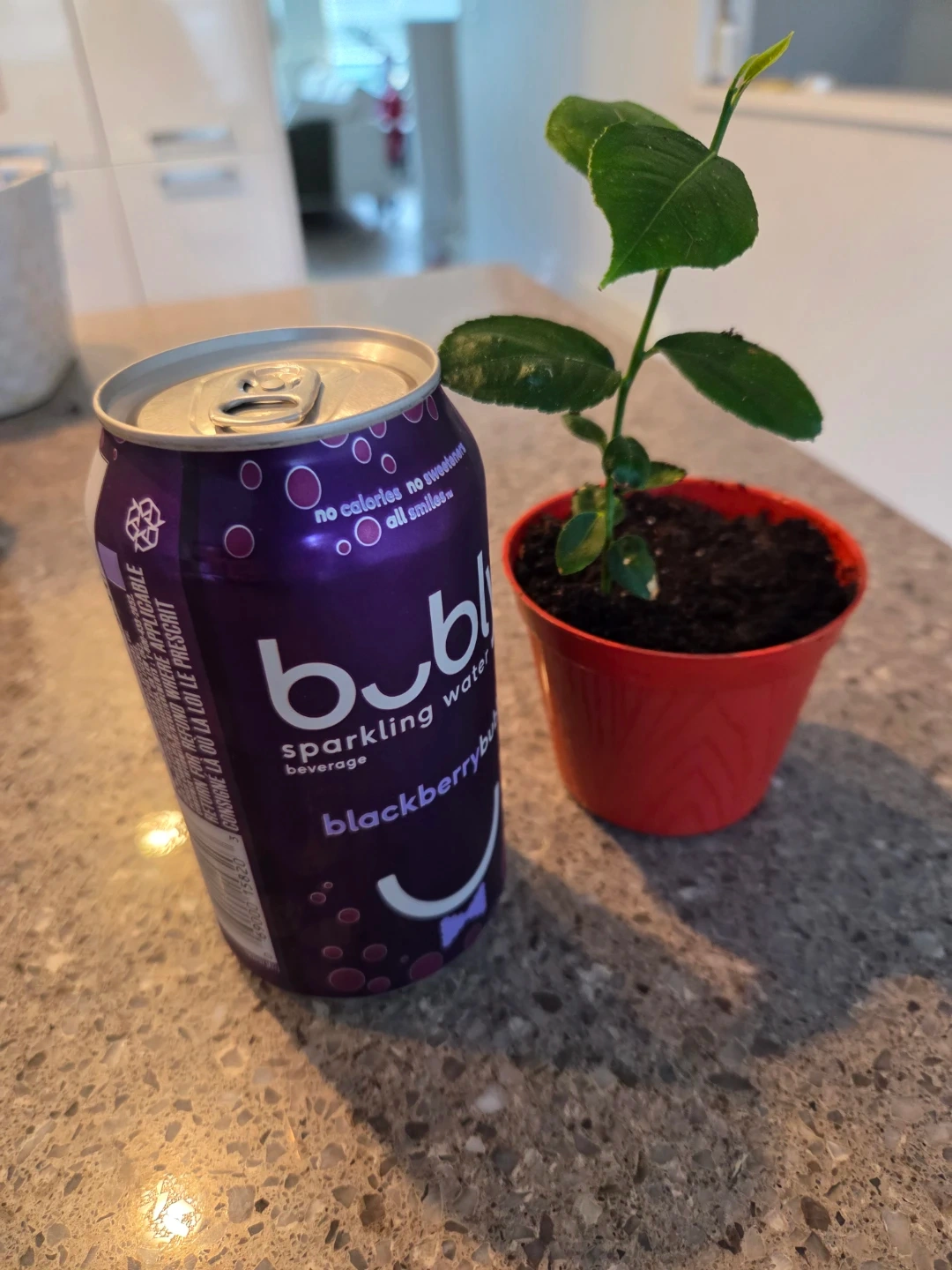 Selling a young lemon tree seedling in a pot. It's a healthy little plant ready to grow into a beautiful lemon tree! Perfect for adding a touch of greenery to your home or garden. Bubly is for size reference. I accidentally tore a lil piece of the leaf. Grown organically from organic lemon seed.