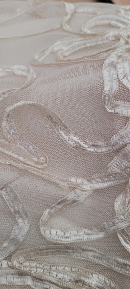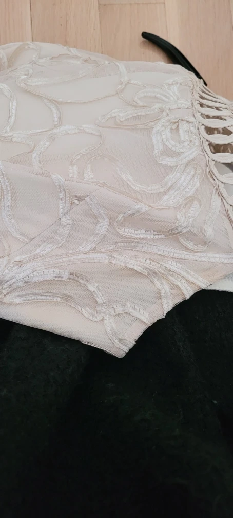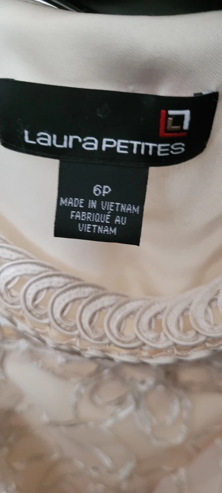 Selling a lovely Laura Petites dress in size 6P. It has a beautiful silver ribbon and lace floral design, plus a regal cleopatra neckline. This dress overall is beige in colour and looks great on individuals 5'3" or 161cm and under. This dress is perfect for cocktail parties, or wedding guest attire.