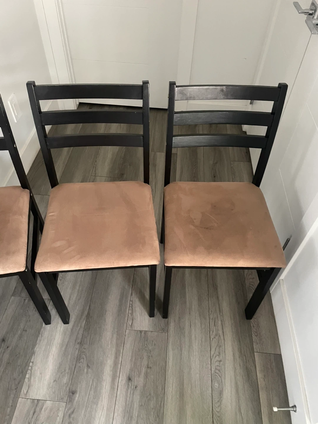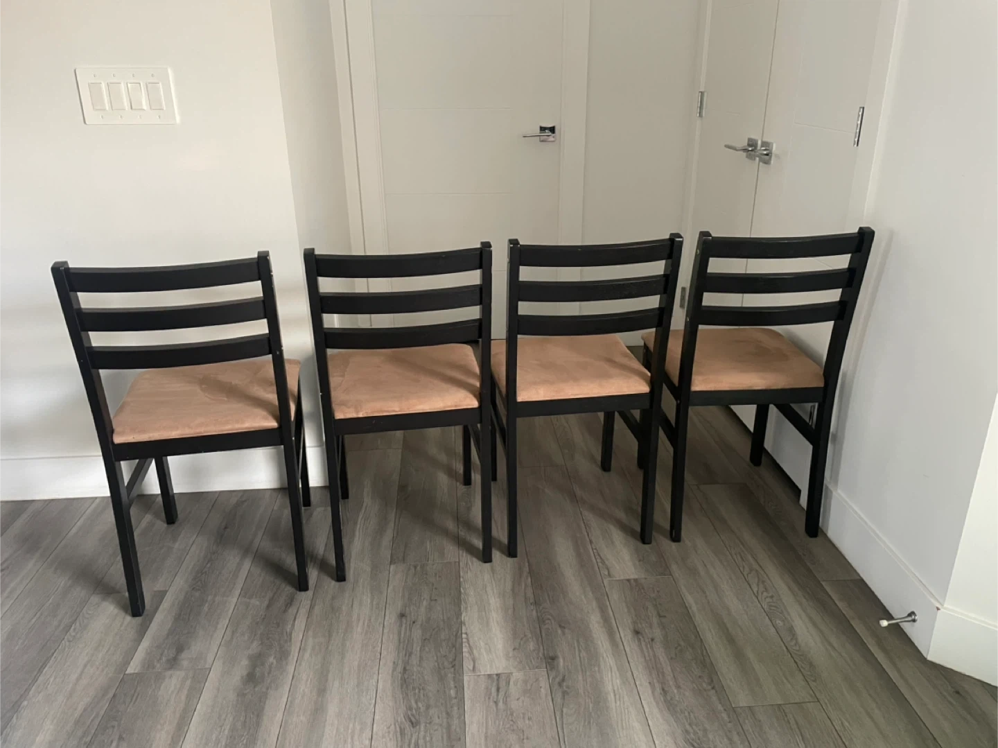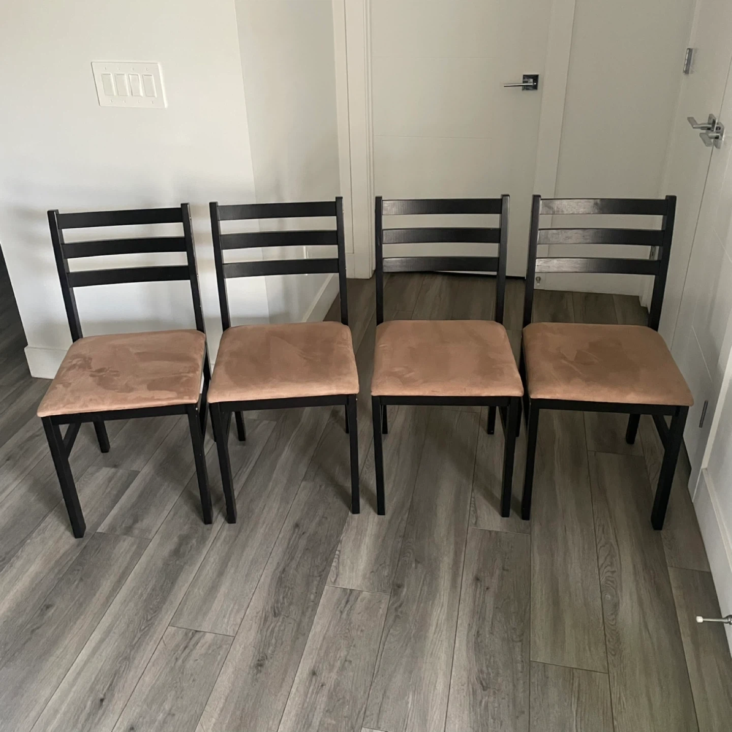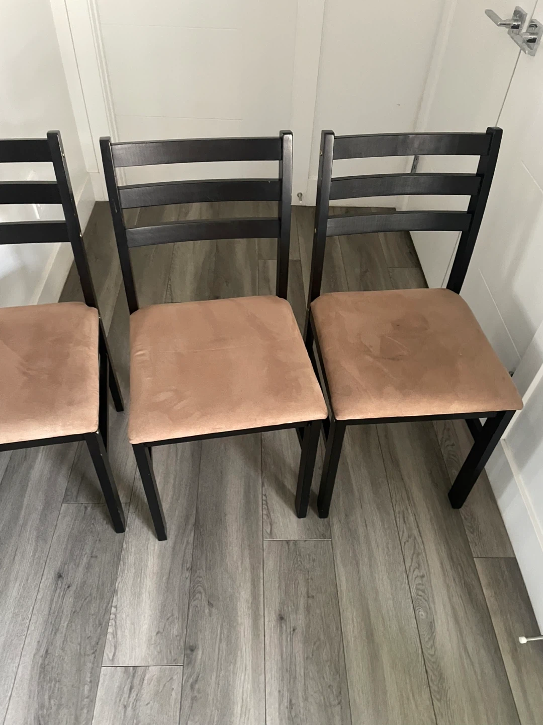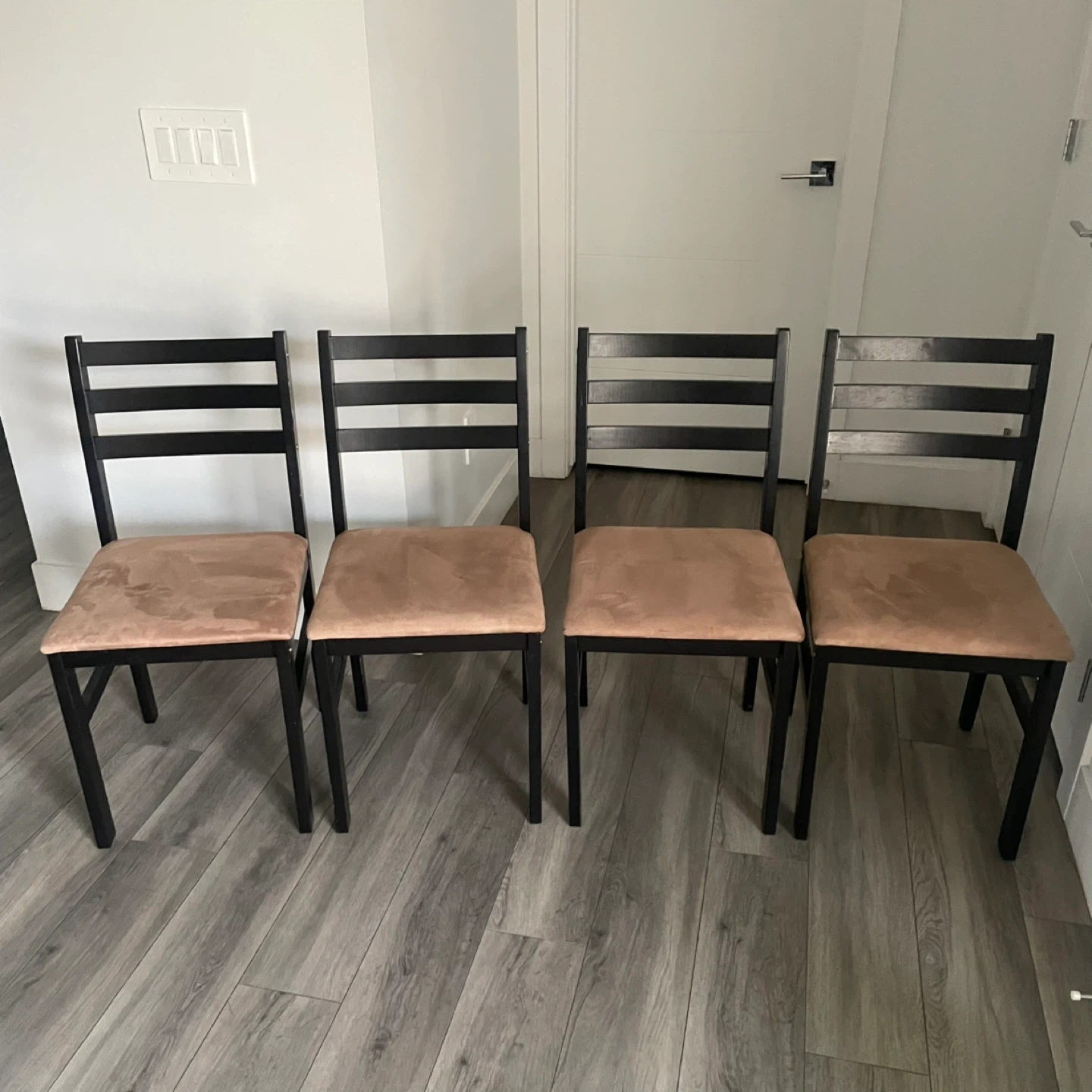 (•$120 For ALL) Set of 4 Dining Chairs. It's In Good Condition Minor Wear. Dark Frame And A Light Brown Cushioned Seat.