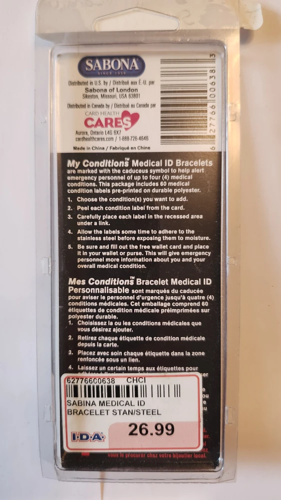 I'm selling a brand new Sabona Medical ID Bracelet in stainless steel! It comes in its original packaging.