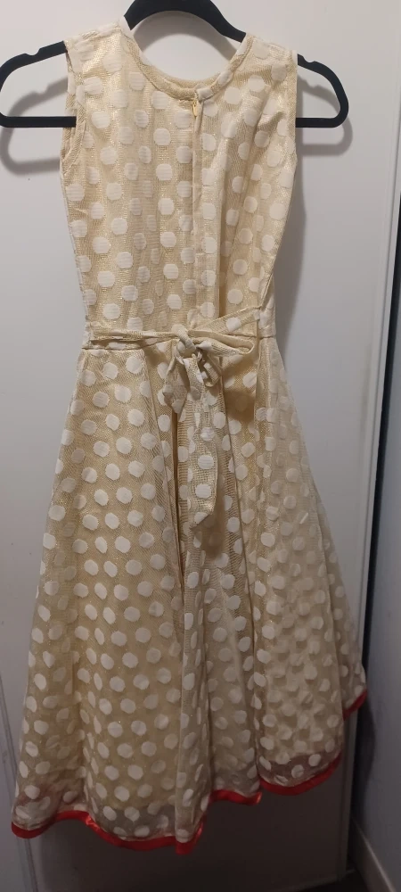 This adorable girls' dress is cream-coloured with white polka dots and features beautiful red rose appliqués. It has a cute tie at the waist and a red trim at the bottom. Perfect for parties or special occasions!