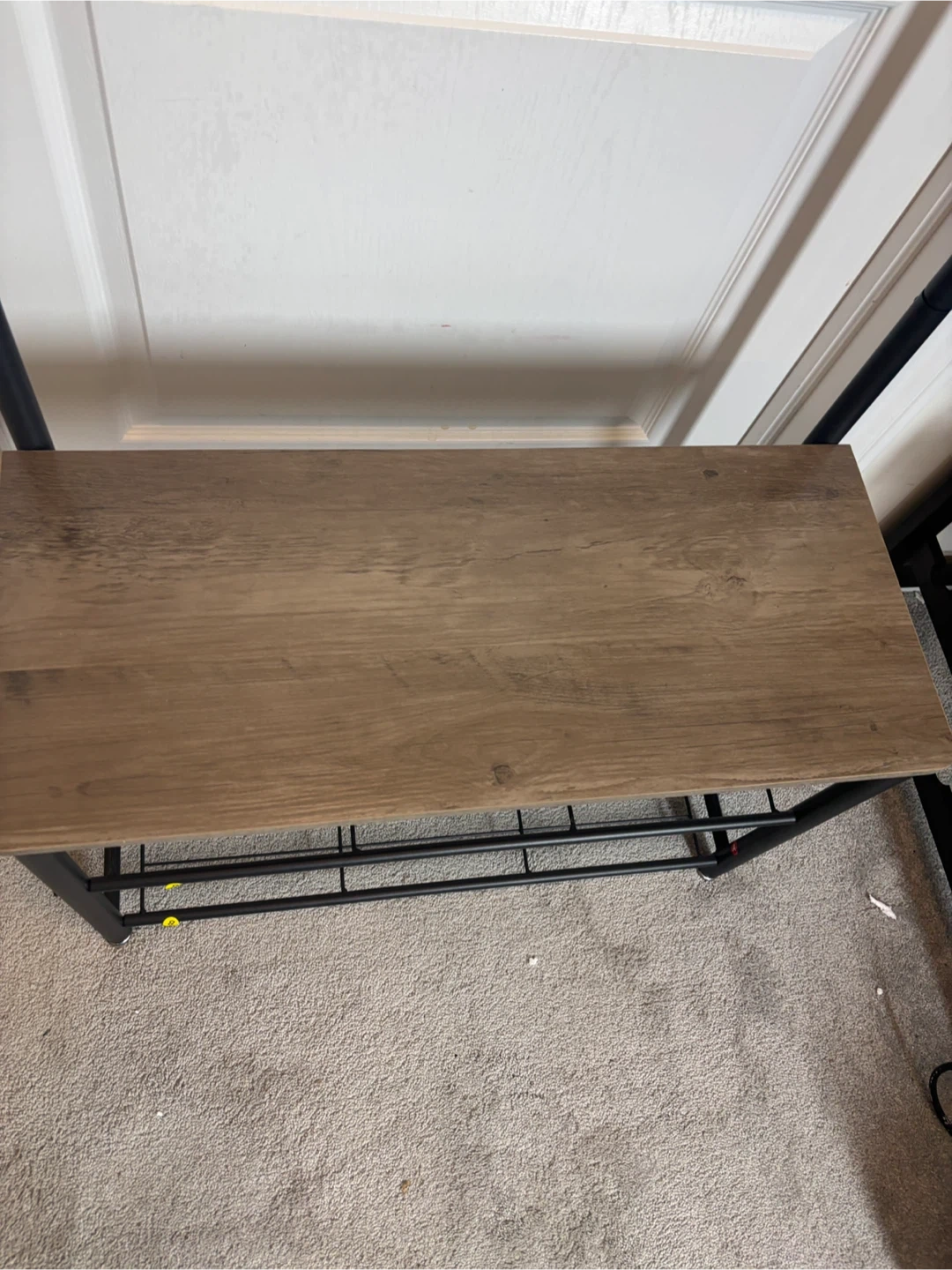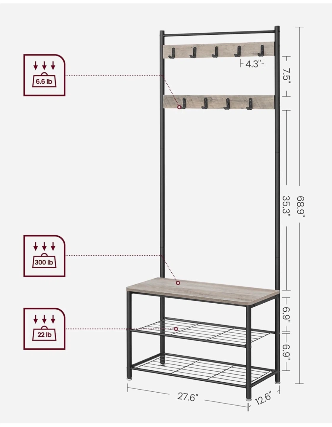 This hall tree is perfect for keeping your entryway organized! It features a bench for sitting, a shelf for shoes, and hooks for coats and hats.