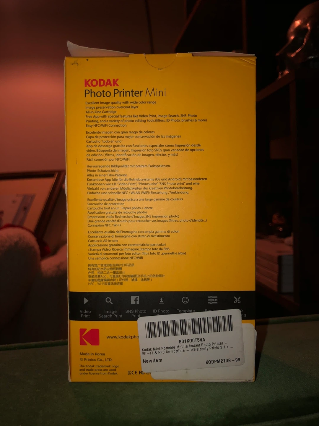 I'm selling a new Kodak Photo Printer Mini, perfect for printing photos directly from your smartphone with WiFi or NFC. It prints credit card size photos (54 x 86 mm) with excellent image quality using dye sublimation thermal transfer. The printer is light and comes with an all-in-one cartridge. Plus, the free app offers easy access and editing features!