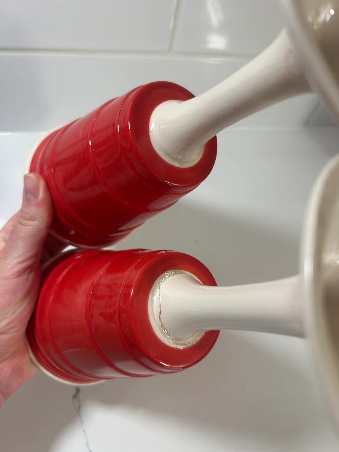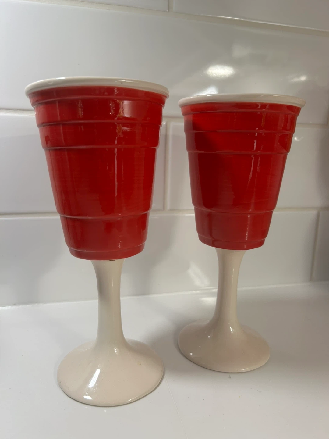 Selling a set of two fun red solo cup wine glasses! They're in great shape and would be perfect for a party or just adding a bit of whimsy to your kitchen. They are made of ceramic, please note one stem broke off and has been super glued back on.